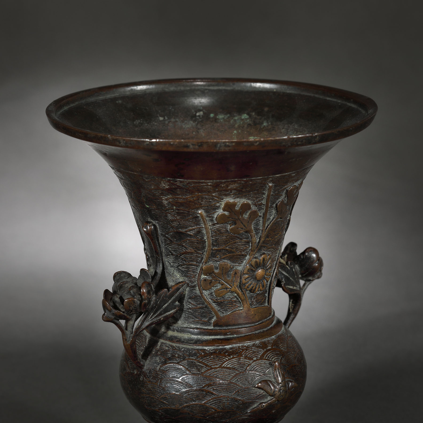 147. Rar vas Gu, din bronz patinat, decorat cu crizanteme, perioada dinastiei Ming, China, sec. XVI-XVII