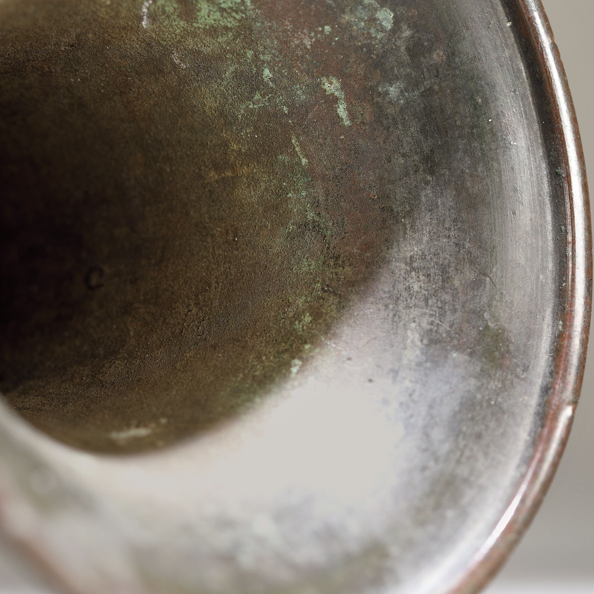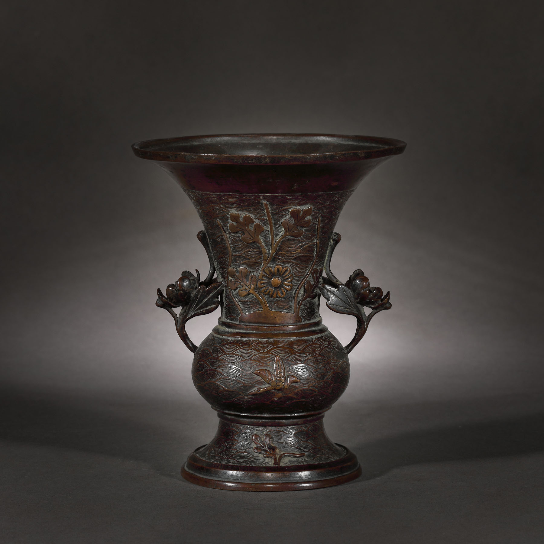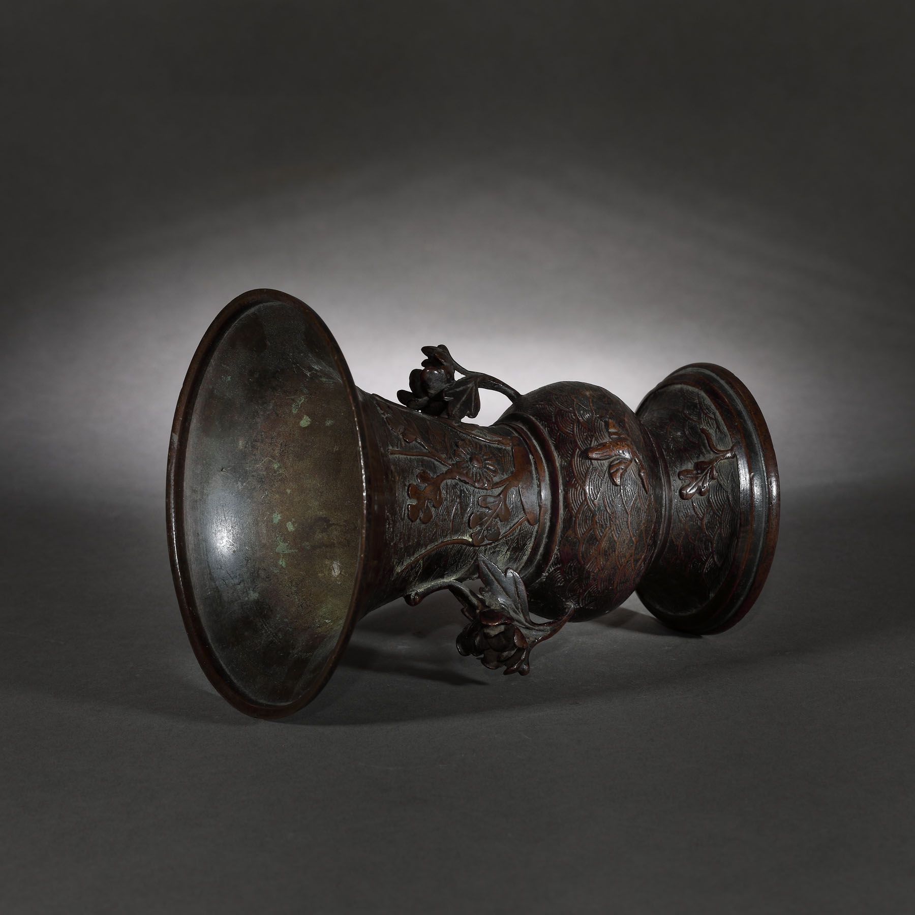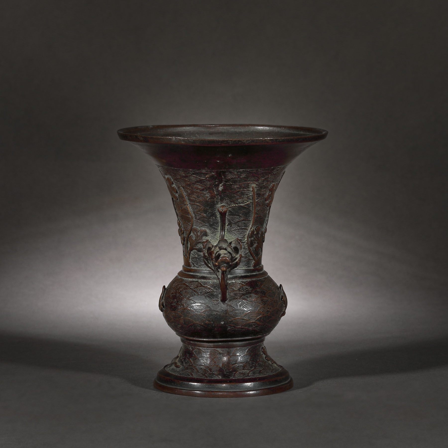 Interesantul vas ritualic chinezesc din bronz, de tip „Gu", datează din timpul dinastiei Ming. În acea perioadă, pe fondul unui interes pentru antichitatea chineză, se reia, printre altele, și producerea unor vase din bronz, precum acest vas de tip „Gu”, a cărui formă arhetipală poate fi regăsită încă începând cu dinastia Shang (sec. XVI-X î.e.n.). Vasul este decorat, în spiritul celor antice, cu motive florale și avimorfe.