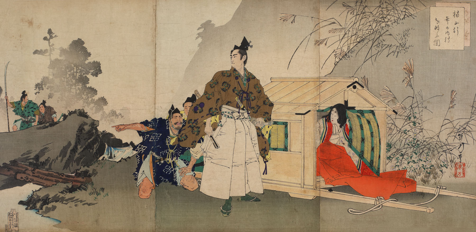 Tripticul semnat de Mizuno Toshikata surprinde o scenă care îl are ca protagonist pe samuraiul Kusunoki Masatsura (1326-1348). Acesta o salvează pe frumoasa doamnă de la curtea imperială, Ben no Naishi, din mâinile unor inamici, dintr-un clan advers. Legenda spune că după acest episod, Împăratul, mișcat de gestul său, a propus ca femeia să îi devină soție. Masatsura a refuzat însă propunerea pentru că în opinia sa nu se putea angaja într-o căsnicie, știind că îl așteaptă cel mai probabil o viață scurtă. Compoziția îl surprinde în centru pe viteazul samurai, aflat lângă palanchinul în care o putem zări pe frumoasa femeie, vizibil îngrijorată la vederea, în planul îndepărtat, a atacatorilor care se apropie.