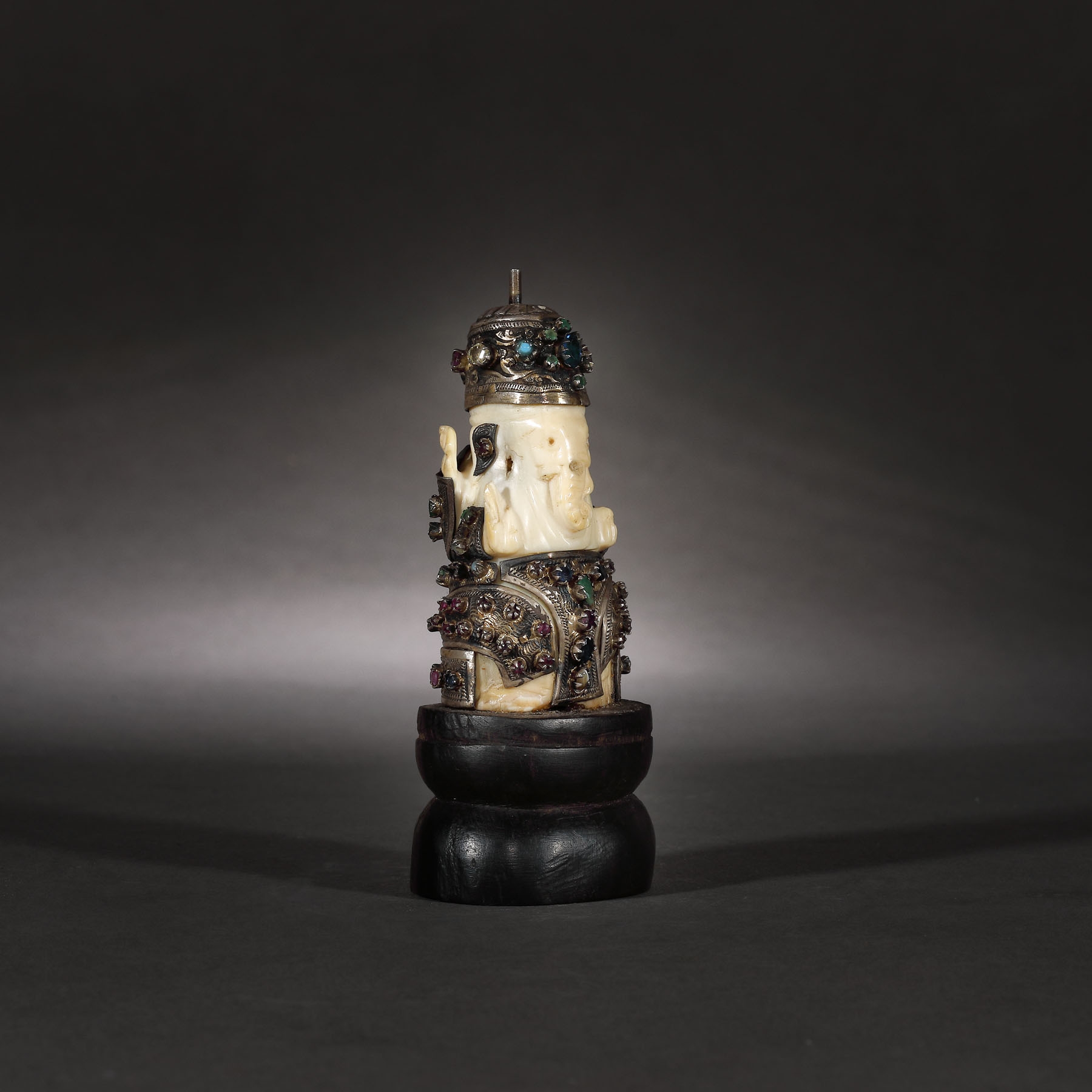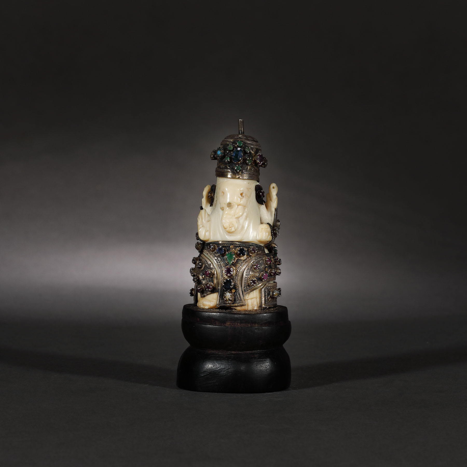 90. Statuetă din fildeș reprezentându-l pe Ganesha, îmbrăcat în argint și pietre prețioase și semi-prețioase, India, sec. XIX