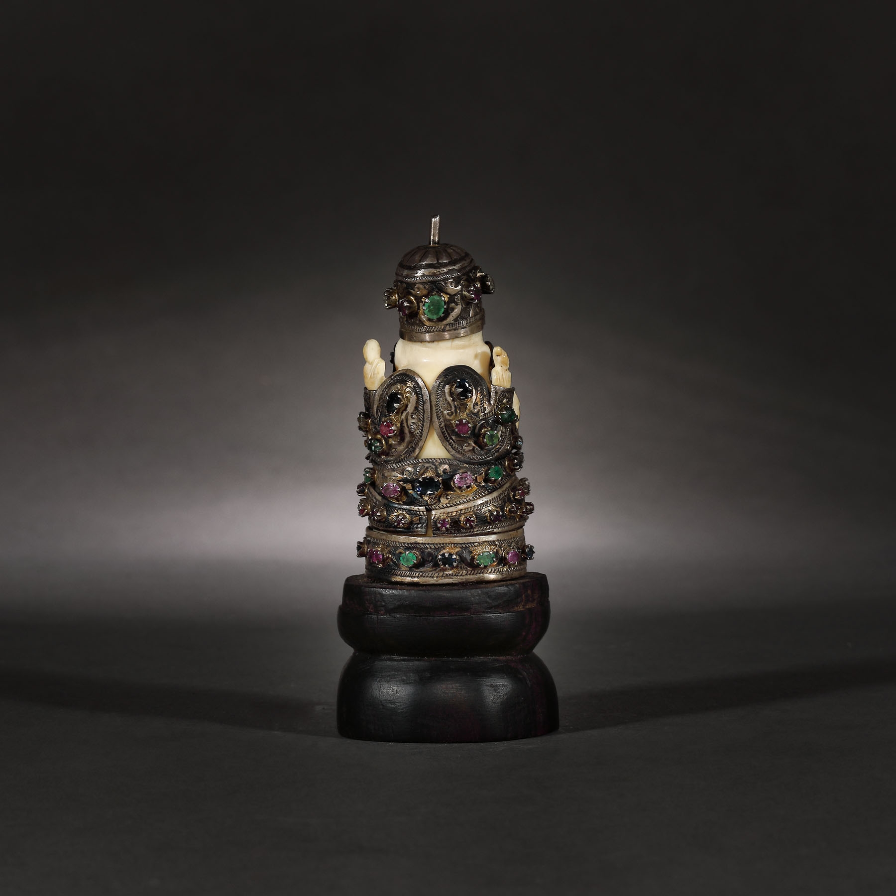 fildeș sculptat, argint 800, pietre semi-prețioase (safire roz, smaralde, crisoberil, safire albastre, turcoaz, sticlă, safire galbene)