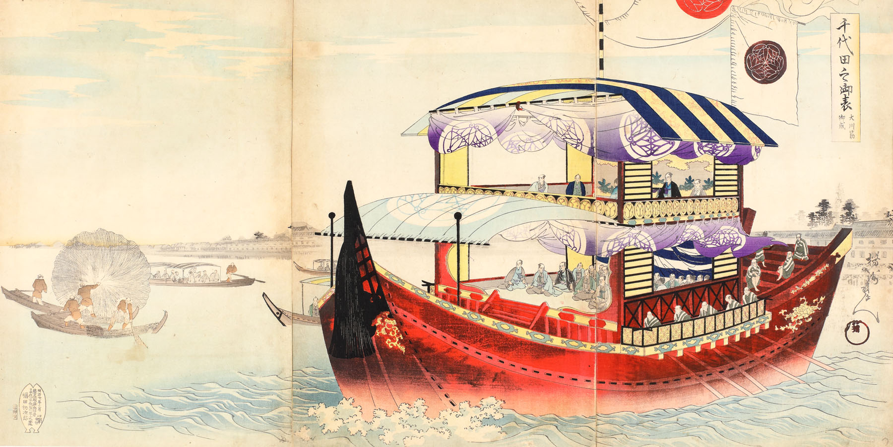Tripticul lui Toyohara Chikanobu, din perioada Meiji, înfățișează, în stilul caracteristic al artistului, o barcă de agrement care plutește pe râul Okawa. Emblema de pe draperiile ce decorează ambarcațiunea este cea a familiei Tokugawa, sugerând că la bord s-ar afla însăși shogunul, înfățișat șezând, la etaj. În apropiere, pot fi zărite bărcile unor pescari.