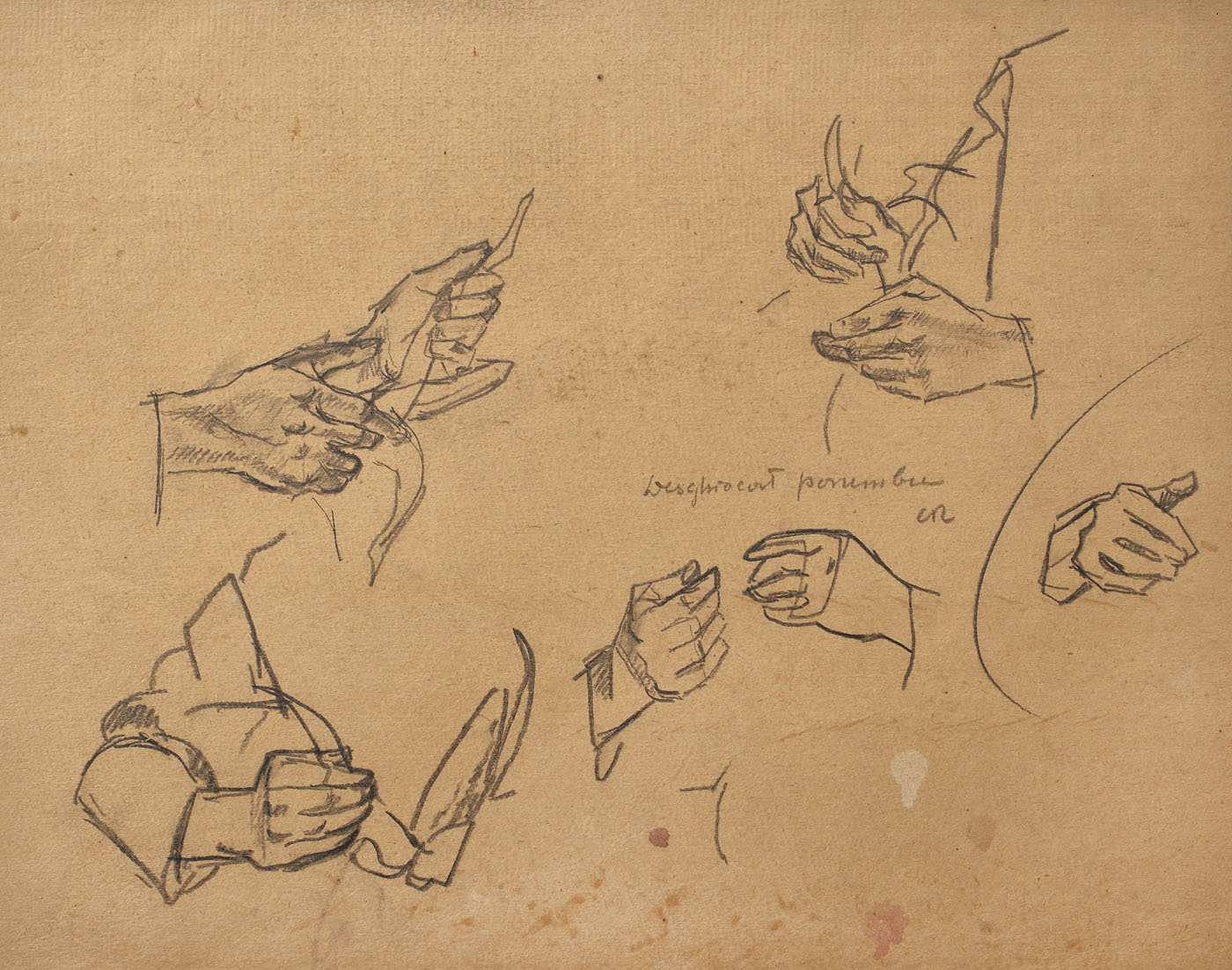 Pe verso menţionat: Studiu de mâini de şa tabloul "Desghiocat porumbul" lucrat la Fundeni (Buzău) în toamna 1915, Celesta Camil Ressu.