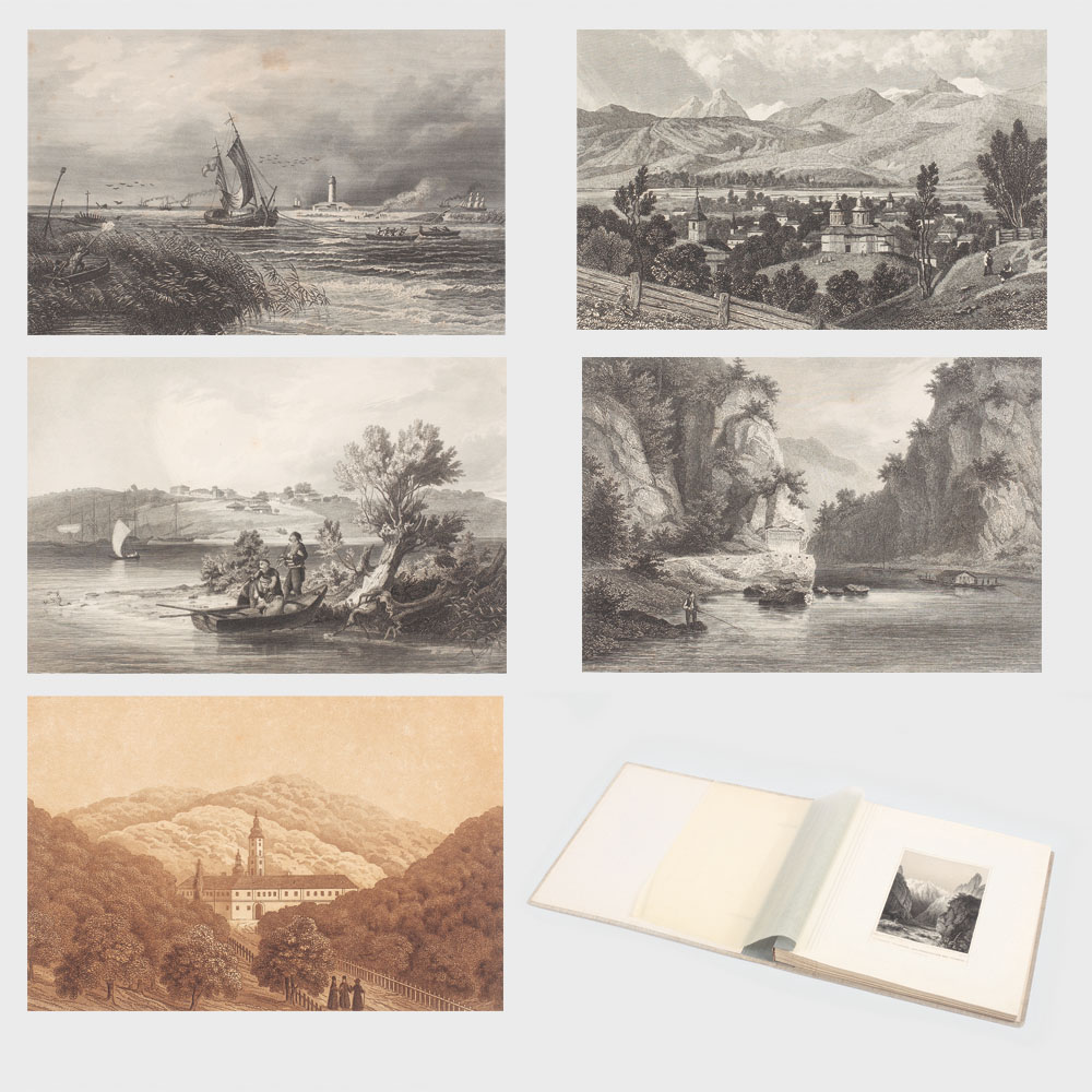 467. Album conținând 19 gravuri și litografii cu peisaje din Transilvania Habsburgică și din Muntenia, sec. XVIII-XIX