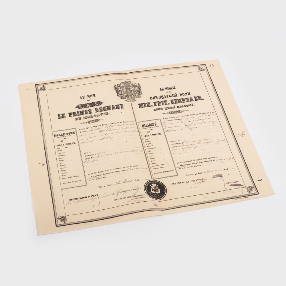 Pașaportul poartă semnăturile boierilor însărcinați cu emiterea lor și antetul domnitorului Mihail Grigore Sturdza (1834-1849). Un astfel de document era indispensabil celor care doreau să călătorească atât în străinătate, cât și dintr-un principat în altul, de la Iași la București, de exemplu.