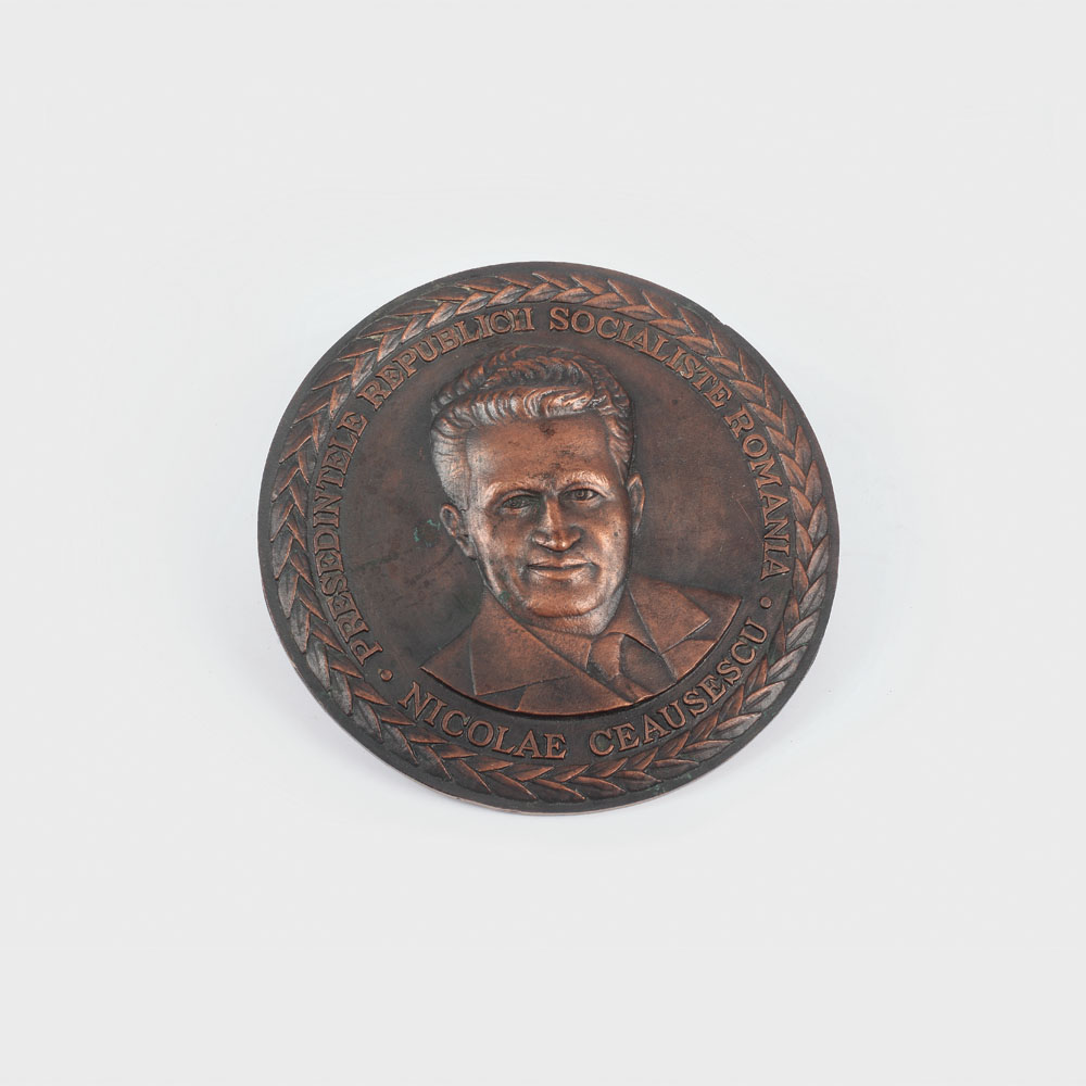 Placheta de mari dimensiuni, din bronz patinat, decora cabinetele secretarilor de partid din întreprinderi. Multe dintre aceste piese au fost distruse în timpul revoluției din decembrie 1989.