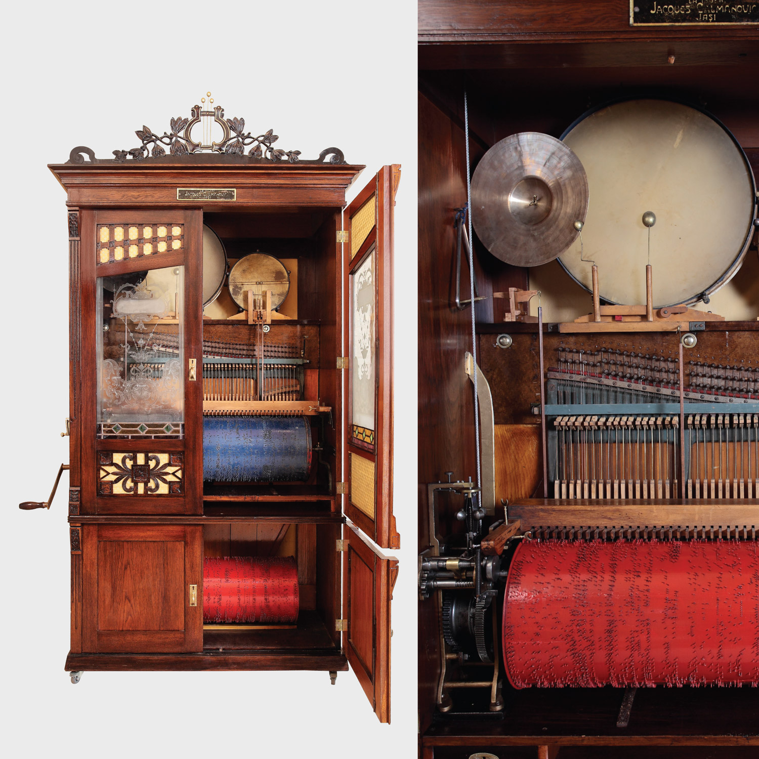 Primele astfel de instalații apăreau la începutul secolului al XIX-lea în spațiul german, de unde se vor răspândi în Europa occidentală și în America de Nord. Orchestrionul este o cutie muzicală de mari dimensiuni asemănătoare unei orgi cu tambur care reproducea sunetele produse de instrumentele muzicale ale unei orchestre. Obiectul reunește mai multe funcții, cea muzicală în primul rând, precum și cea decorativă, deoarece prin realizarea sa apare și ca piesă de mobilier decorativ. Partea centrală este formată dintr-unul sau mai mulți cilindri cu pinioane pe care este înregistrată muzica ce provine de la mai multe instrumente muzicale. În esență, este un instrument mecanic muzical complex, acționat fie mecanic, fie electric în formele mai târzii decât piesa de față. Principiul de funcționare este cel vacuumatic. În România, o piesă similară se găsește la Complexul Muzeal Național "Moldova" din Iași. Piesa dispune și de un cilindru de schimb care are înregistrate alte melodii și care poate fi depozitat în partea de jos a orchestrionului. Orchestrionul poartă marca distribuitorului Jacques Calmanovici, proprietar al magazinului de profil "La înger" din Iași. Melodiile înregistrate, în număr de 16 în total, fac parte din repertoriul popular românesc și din cel monden, precum "Hora pe bătae", "Chindia olteanului", "Bulgărașul", "Susi Walser", "Hercules Vals", "Polca Serafina" și altele.