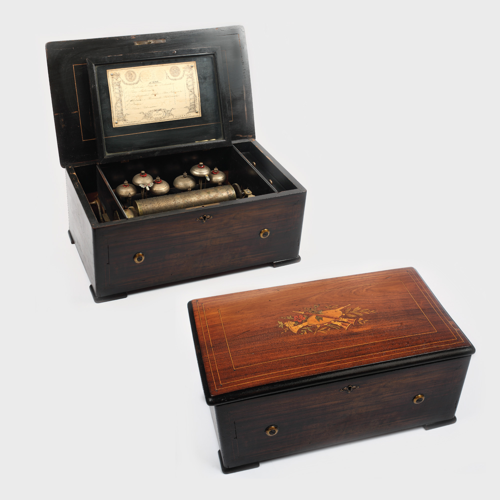Compania elvețiană fondată de Charles Auguste Paillard producea la sfârșitul sec. XIX unele dintre cele mai căutate cutii muzicale din Europa. Piesa de față este compusă dintr-un mecanism original format dintr-un cilindru central pe care este înregistrată melodia și o serie de trei elemente de percuție care redau notele.