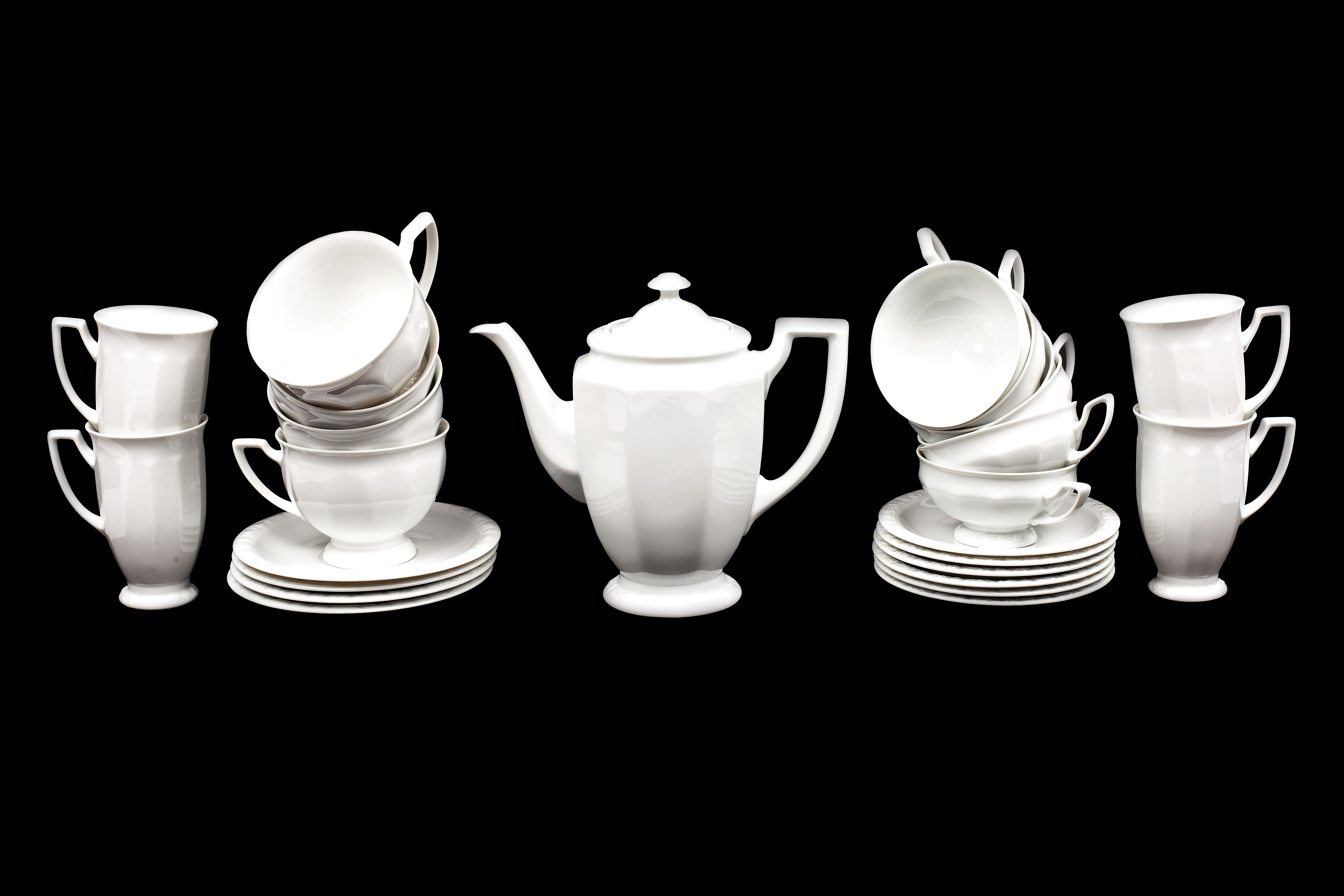 Serviciu format din ceainic, 6 cești medii cu farfurioare, 4 cești mari cu farfurioare și 4 căni pentru lapte.