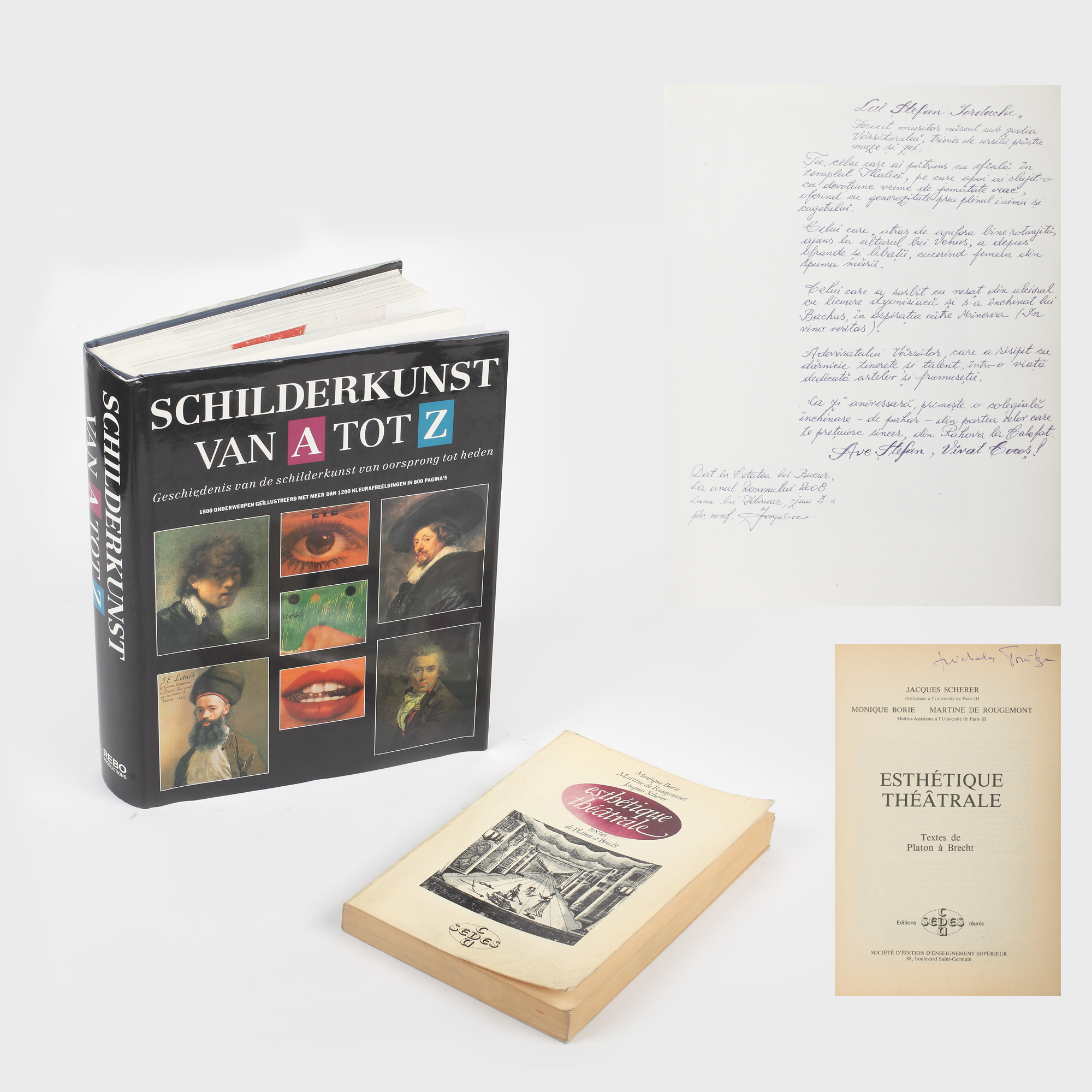 39. Lot format din album de artă dedicat lui Ştefan Iordache, intitulat "Schilderkunst van A tot Z" şi volumul "Estetique theatrale" dedicat soţiei actorului, Mihaela Tonitza