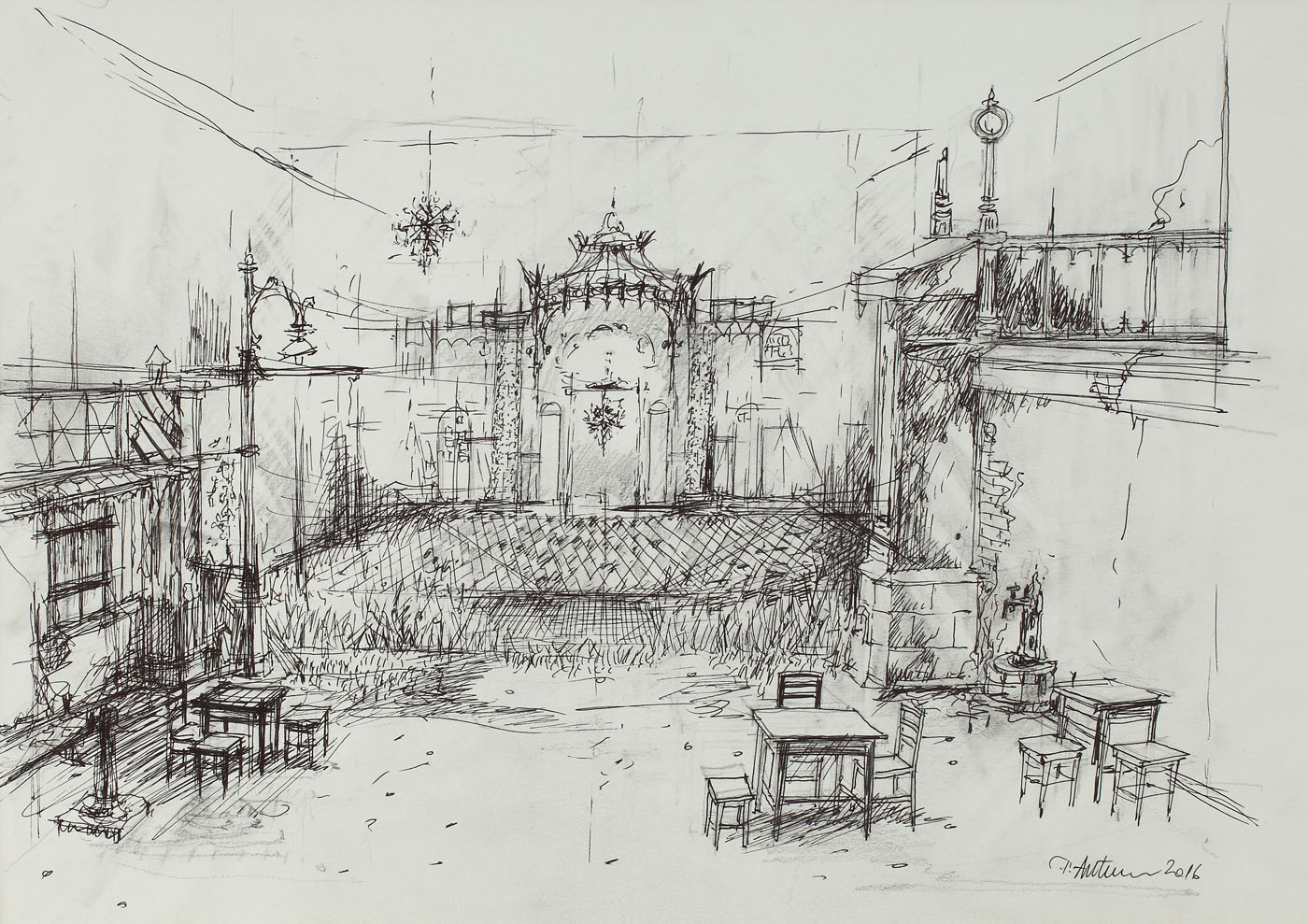 37. Schiță de decor, pentru spectacolul "Domnișoara Nastasia", de George Mihail Zamfirescu, în regia lui Mihai Mălaimare, teatrul Masca, 2016, provine din colecția Puiu Antemir