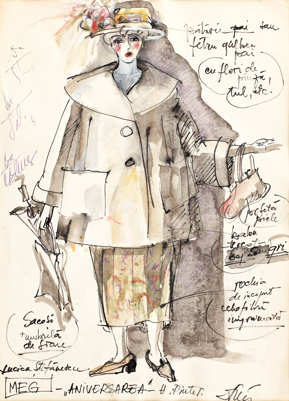42. Schiţă pentru costumul personajului Meg, spectacolul "Aniversarea", de Harold Pinter, regia Emil Mandric, Teatrul Toma Caragiu, Ploiești