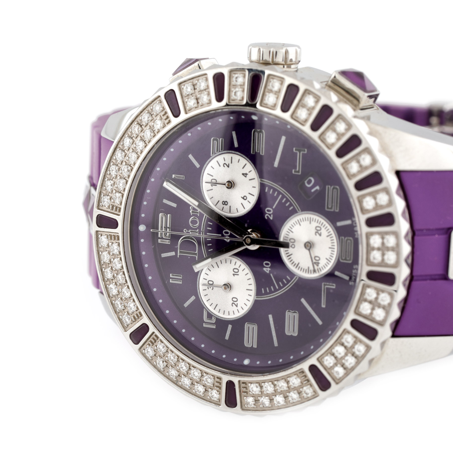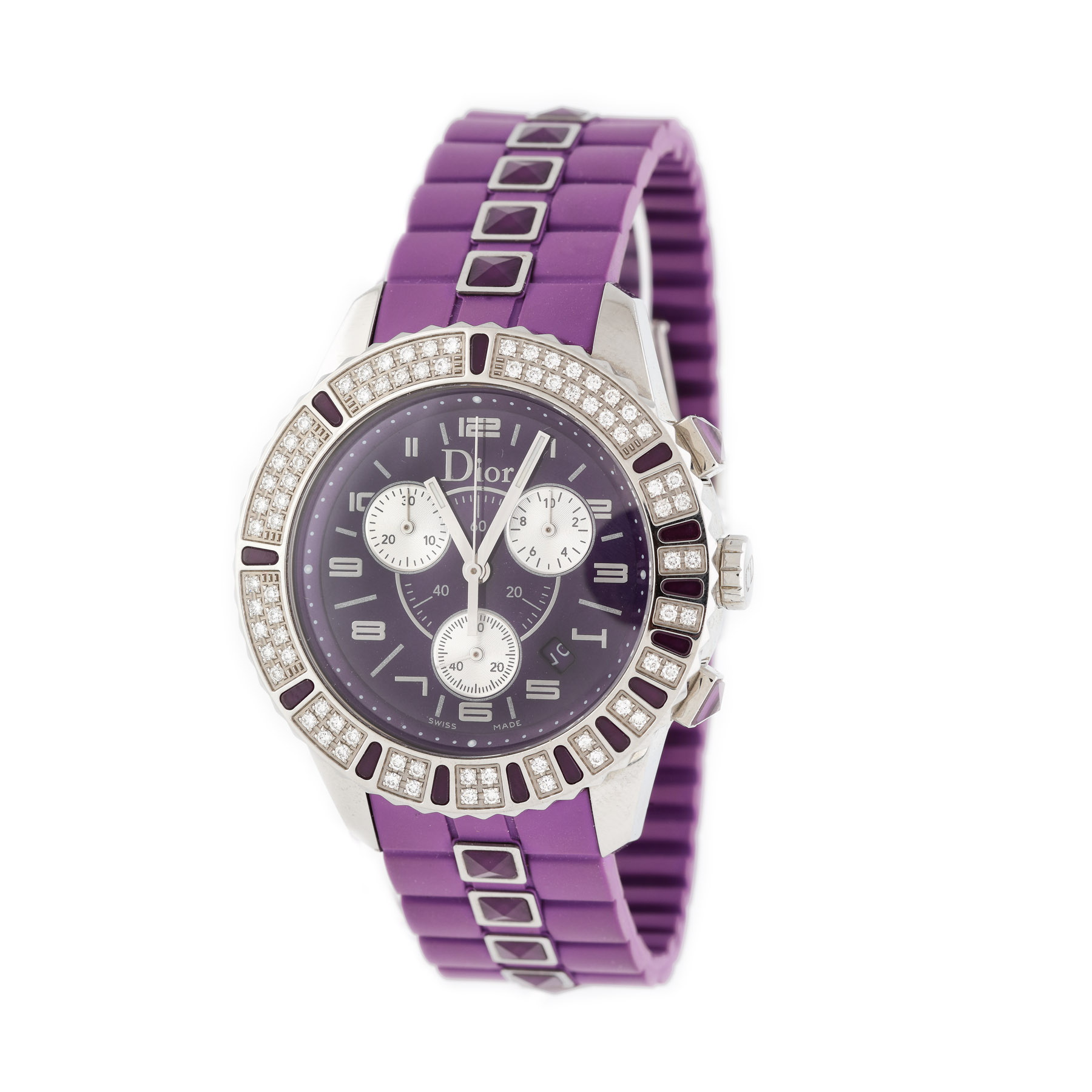 Ceas Dior, de mână, de damă, referință: CD11431J. Mecanism chronograf quartz. Cadran de culoare violet, cu cifre arabe, trei registre și dată între orele 4 și 5. Bezel decorat cu pietre ornamentale. Curea din silicon de culoare mov și închizătoare tip deployant. Ceasul necesită schimb baterie.