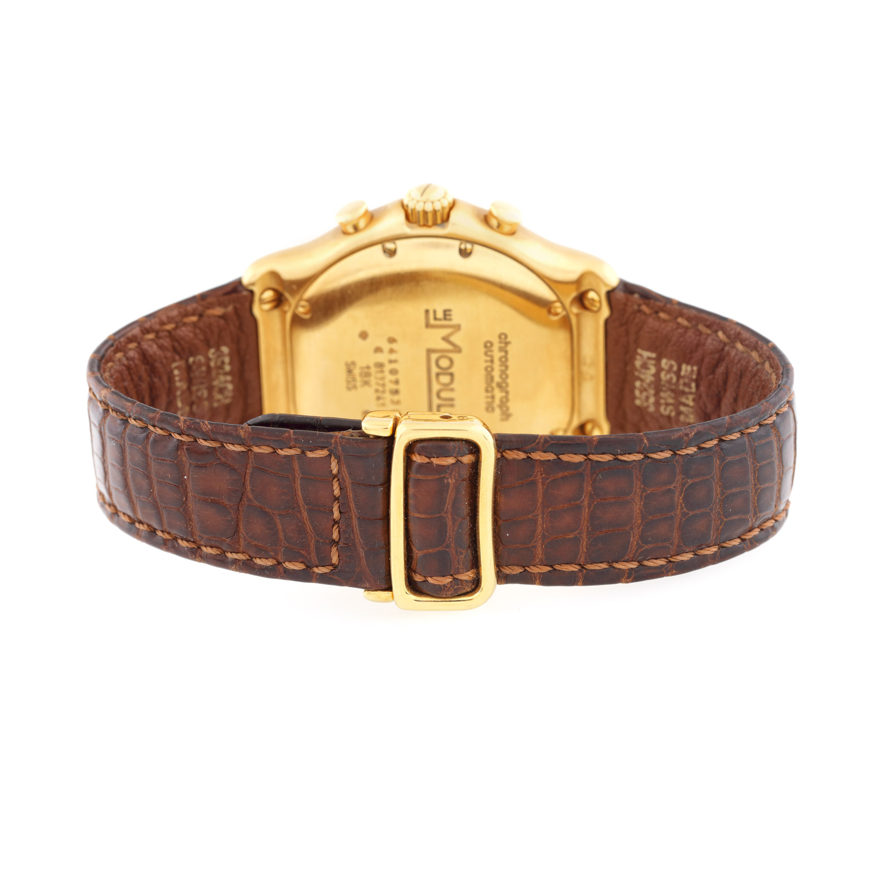 Ceas Ebel Le Modulor Chronograph, din aur, de mână, bărbătesc, referința: 8137241, mecanism automatic, calibru: 137. Cadran de culoare auriu cu cifre romane, dată între orele 4 și 5 și trei registre. Curea din piele de crocodil, de culoare maro și închizătoare tip deployant din aur. Ceasul vine însoțit de cutie.
