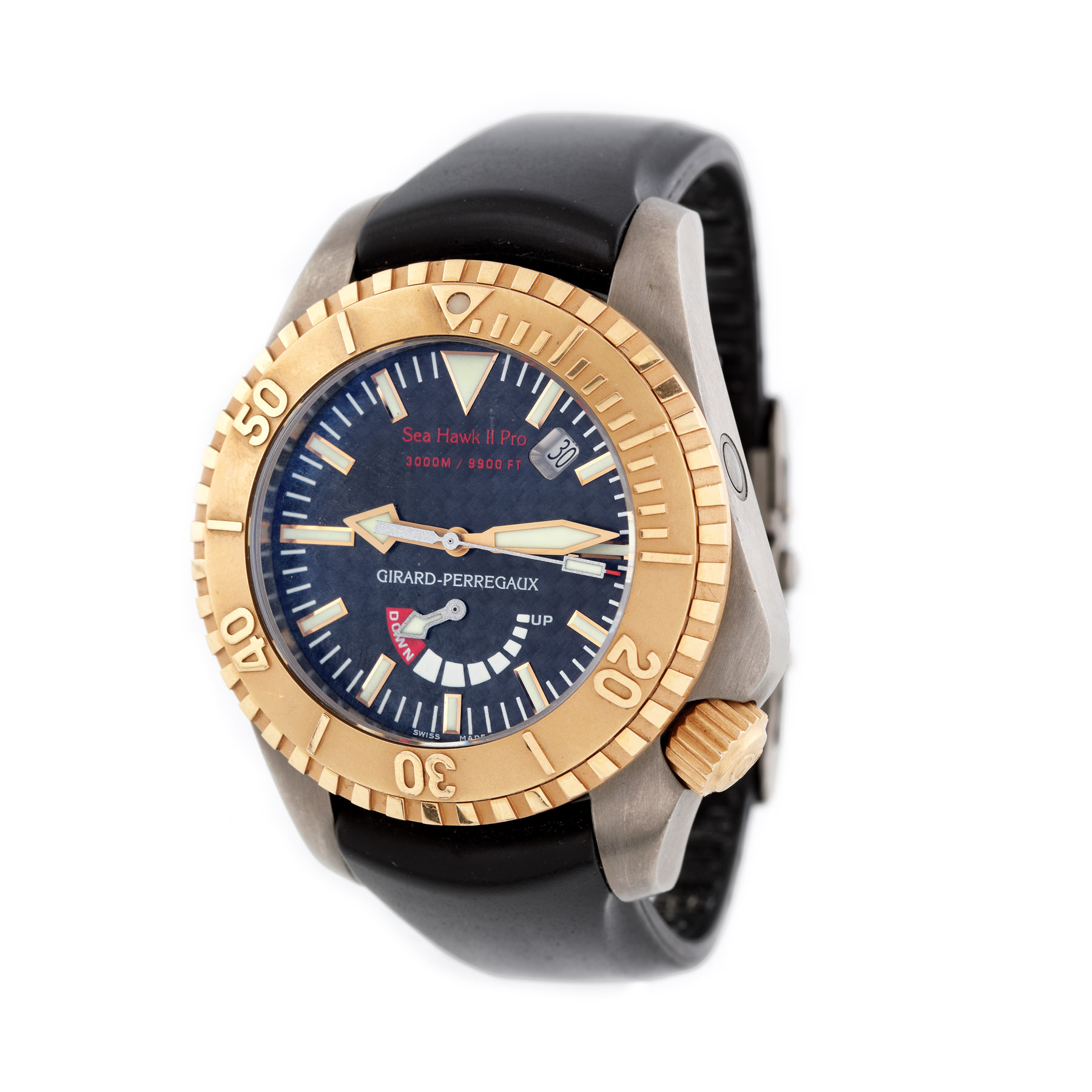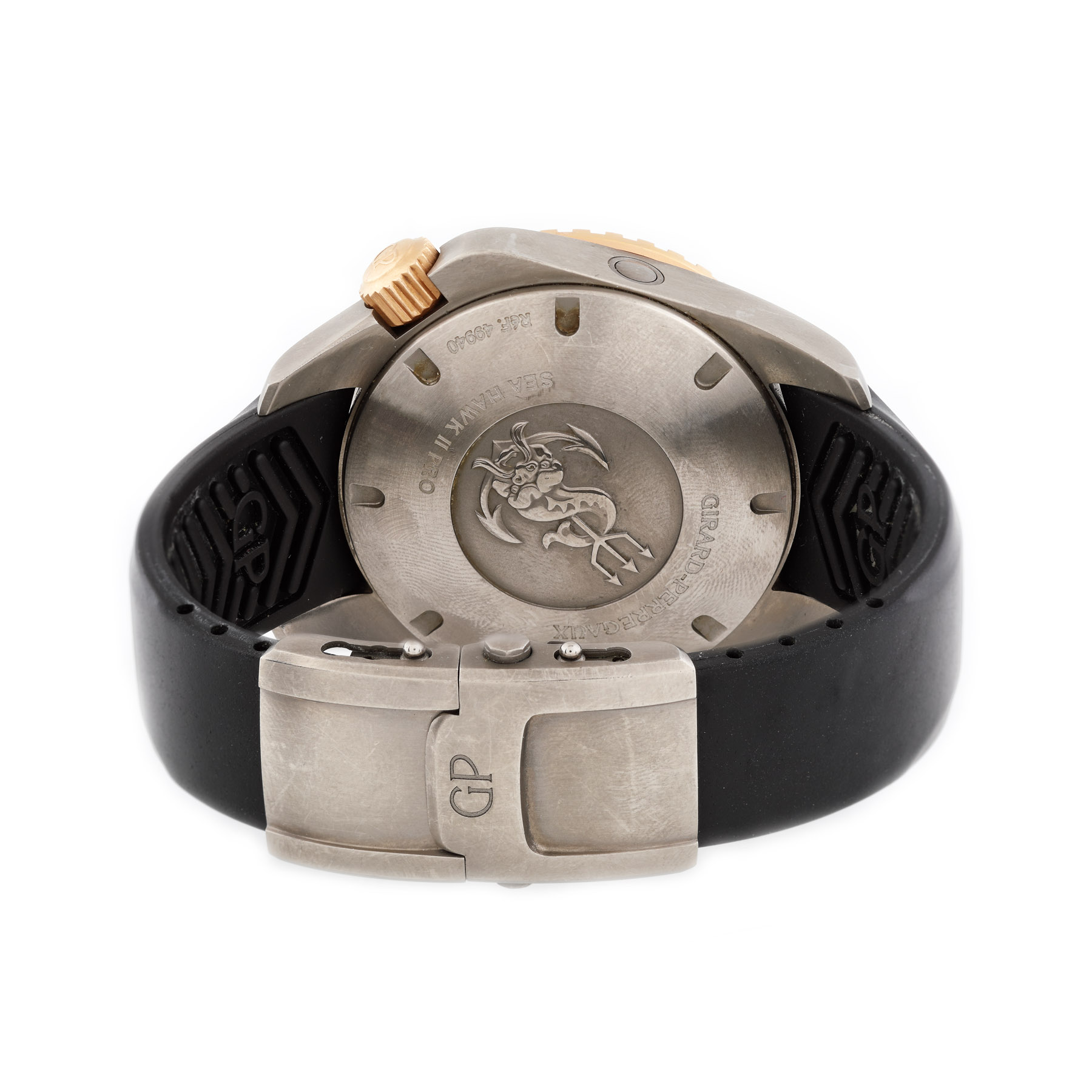 Ceas Girard Perregaux Sea Hawk II Pro din aur roz și titan, de mână, bărbătesc, referință: 49940. Mecanism automatic. Cadran din carbon, cu data între orele 1 și 2 și rezervă de timp la ora 6. Curea din cauciuc de culoare negru și închizătoare tip deployant. Ceas diver asigurat până la 3000 m adâncime. Vine însoțit de cardul de garanție.