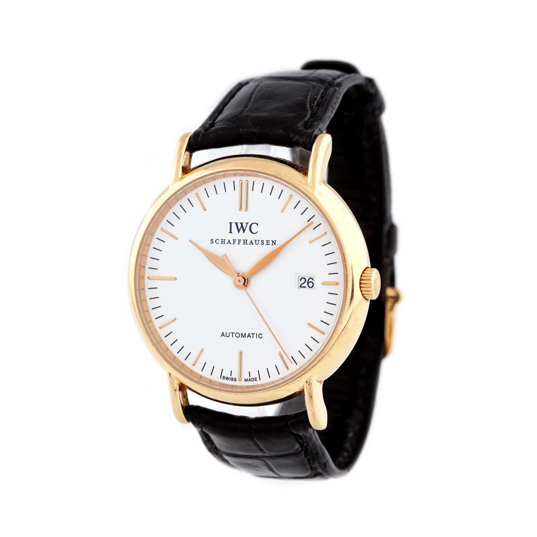 Ceas IWC Portofino de mână, unisex, referință: IW353321, mecanism automatic, calibru: 30110, cadran de culoare alb și dată la ora 3. Curea din piele de crocodil și cataramă originală din aur de 18 k.