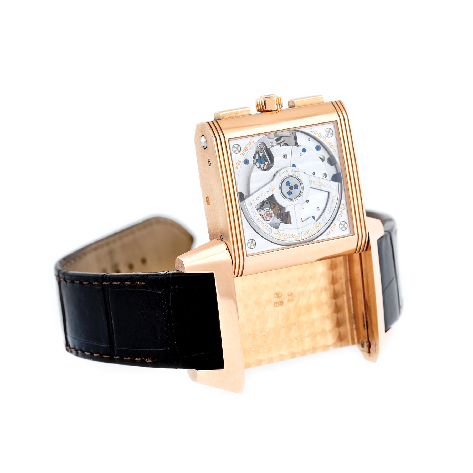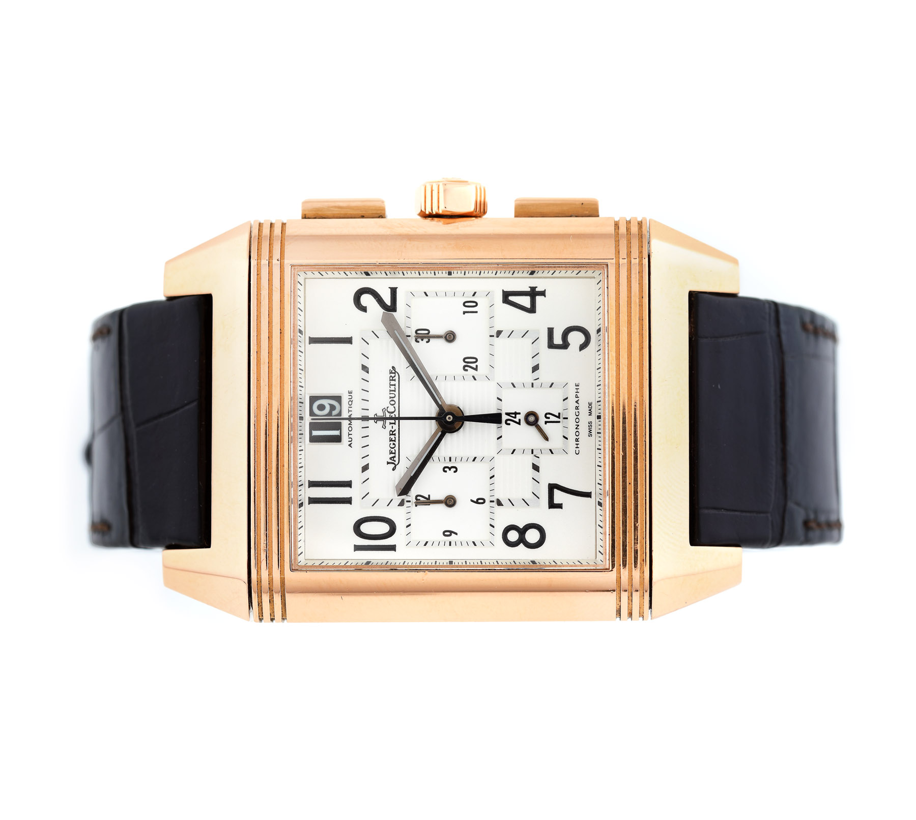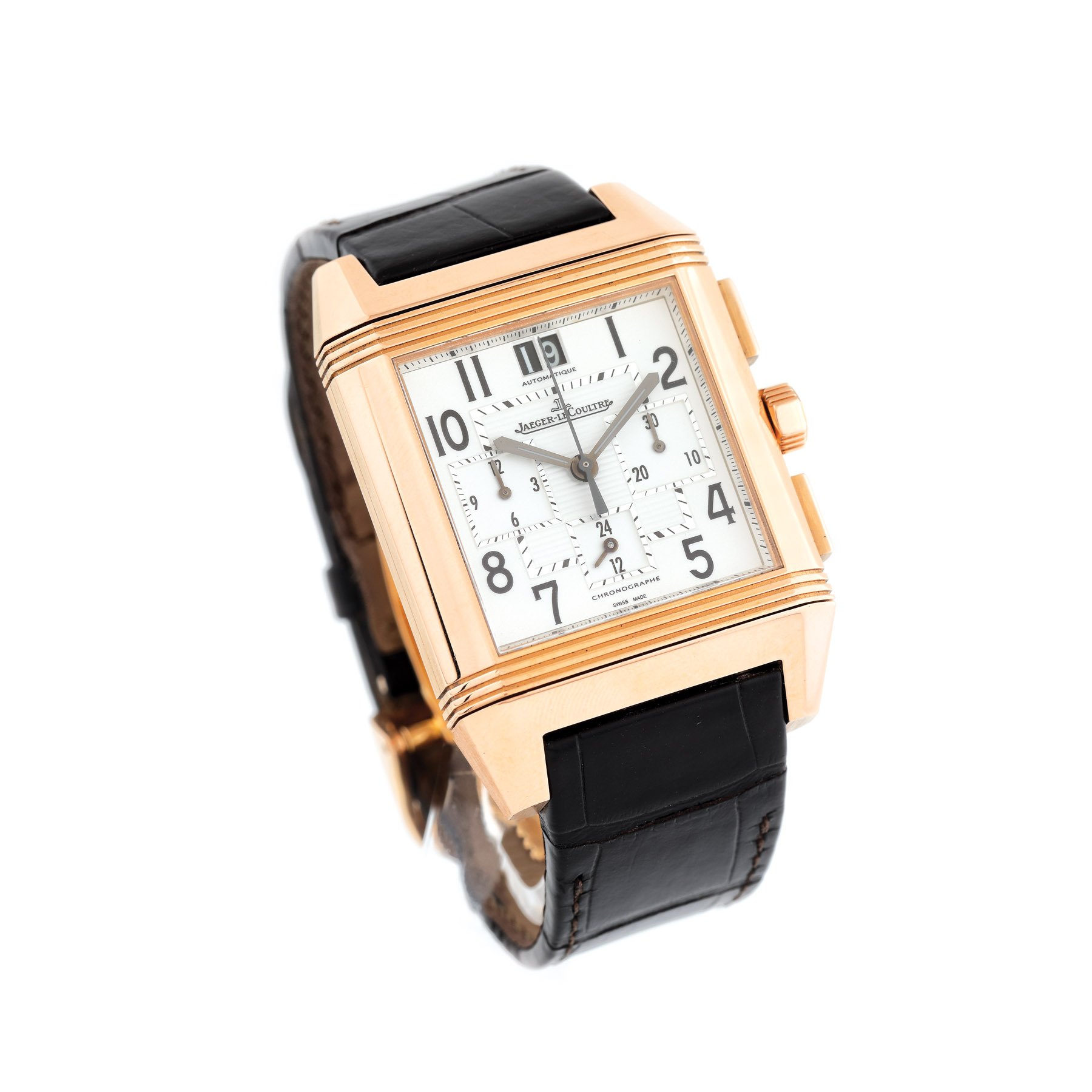 Ceas Jaeger LeCoultre Reverso Squadra, din aur roz, de mână, bărbătesc, cu referință 230.2.45, mecanism automatic chronograph vitrat, cadran alb tip square cu cifre arabe, trei registre și dată panoramică la ora 12. Curea neagră din piele de aligator și închizătoare tip deployant din aur roz.