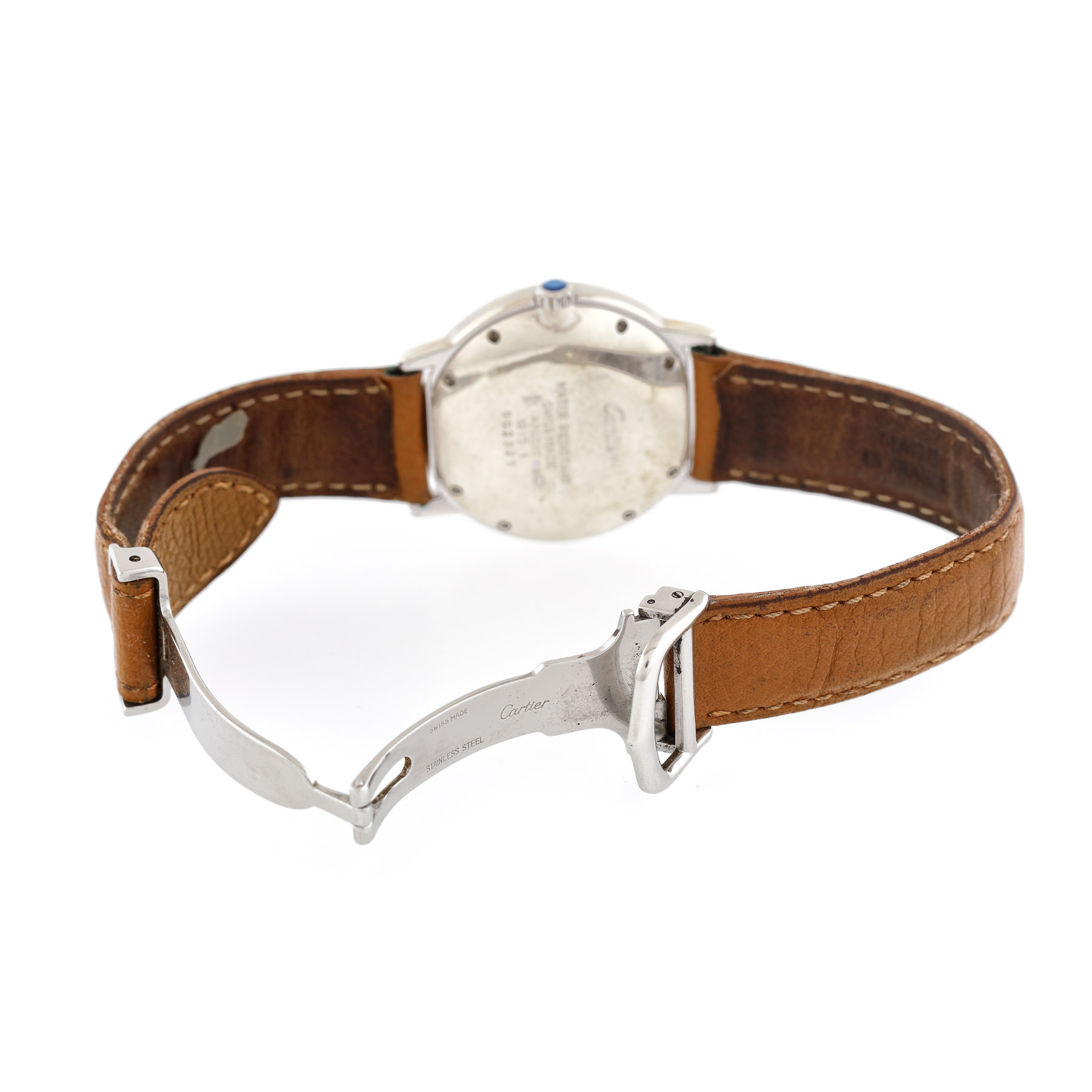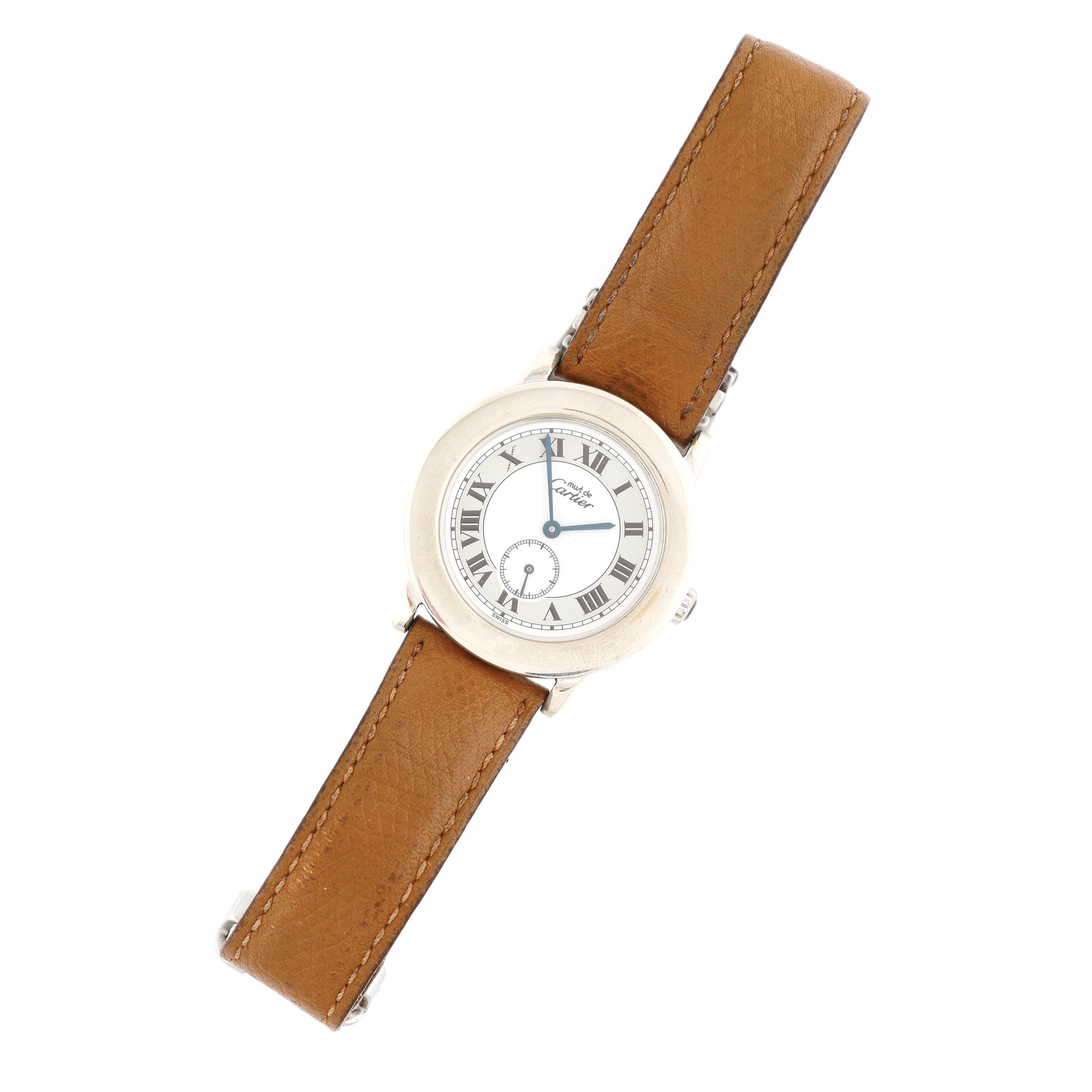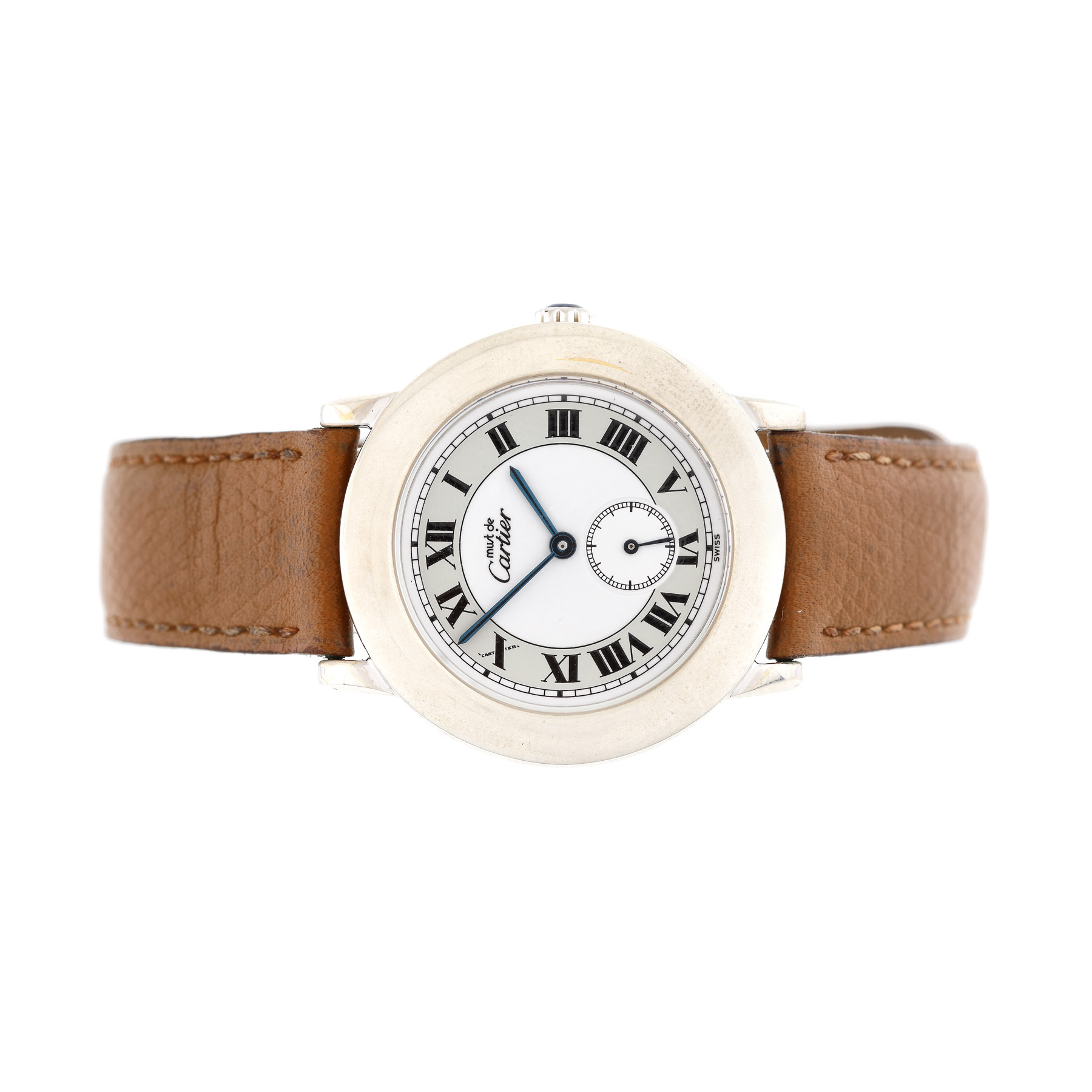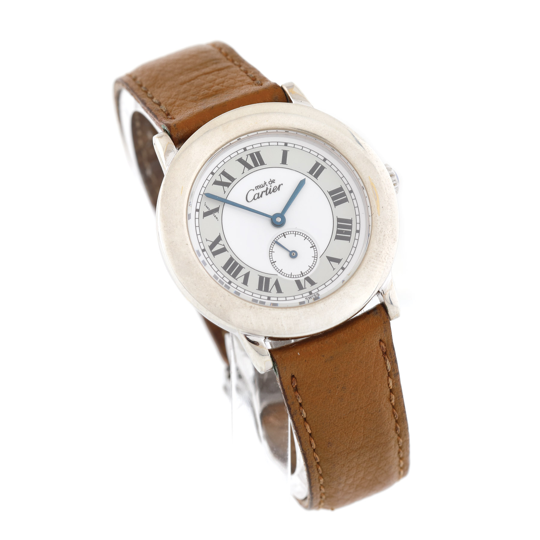 Ceas Must de Cartier Ronde, de mână, de damă, referință: 1815, mecanism quartz, cadran de culoare alb cu cifre romane și secundar la ora 6. Curea din piele de culoare brun și închizătoare tip deployant din oțel inoxidabil.