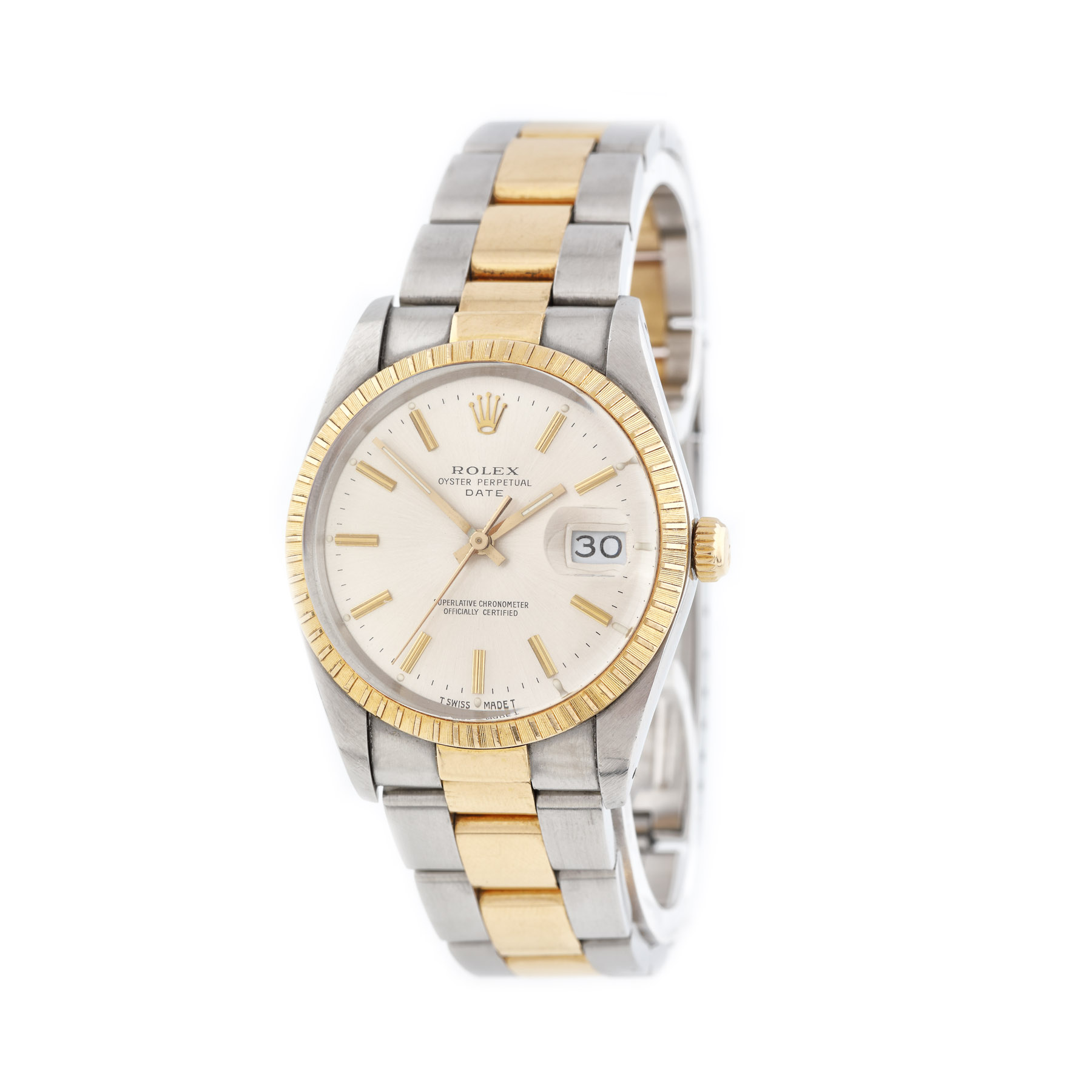 Ceas Rolex Oyster Perpetual Date din aur și oțel, de mână, unisex, referință: 15053. Mecanism automatic, calibru: 3035. Cadran din tritiu de culoare argintie, cu dată și lupă la ora 2.