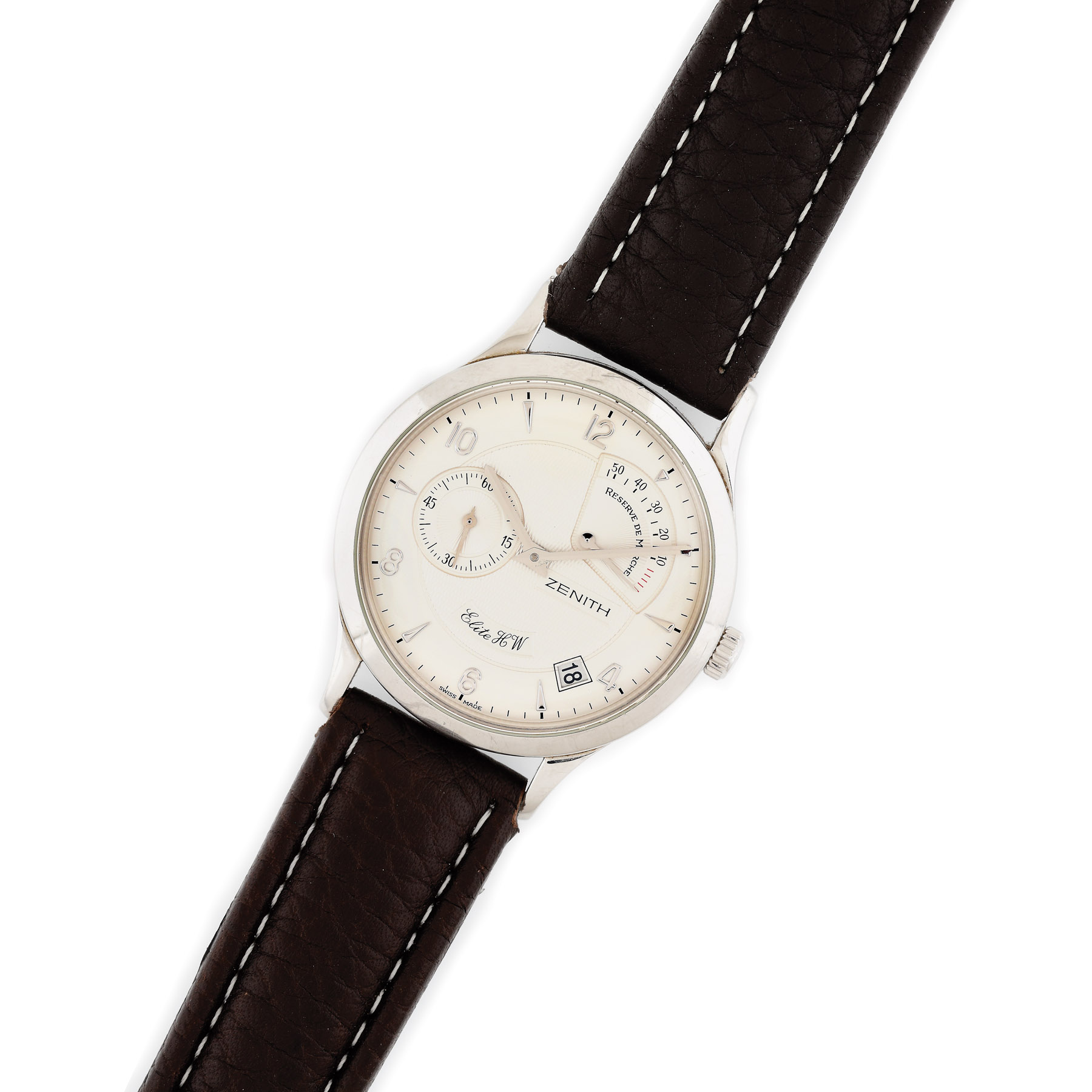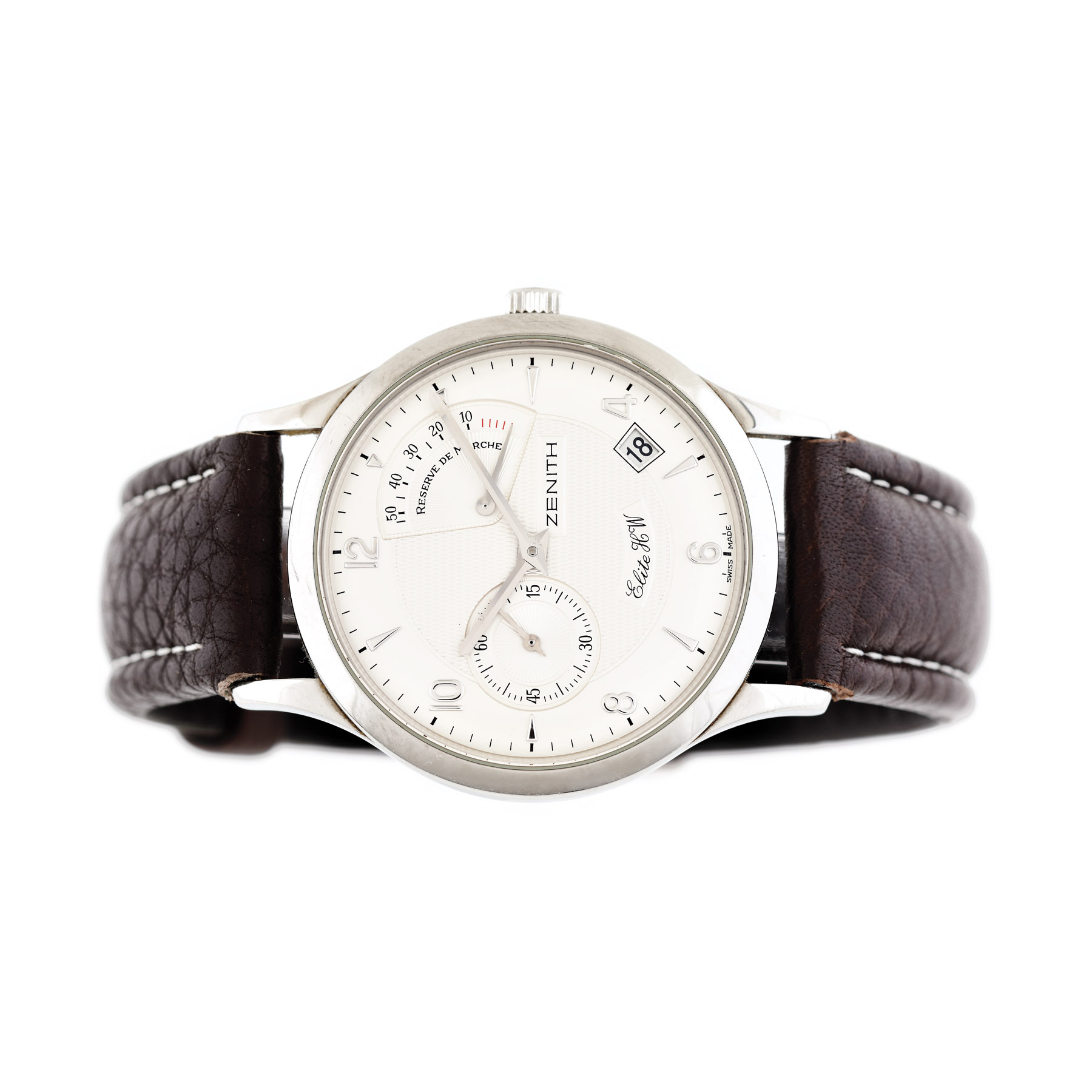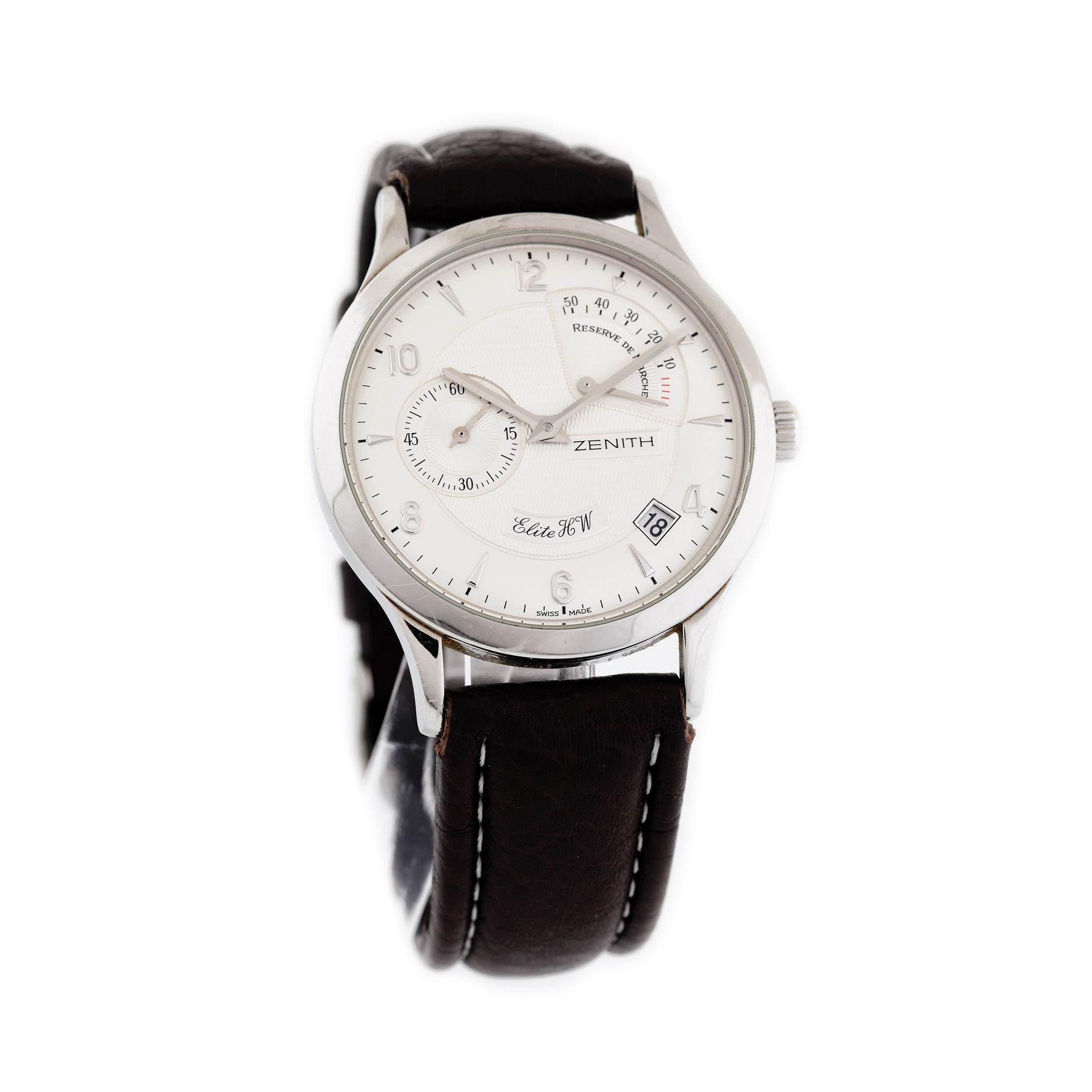 Ceas Zenith Elite HW, de mână, bărbătesc, referință: 01.1125.655, mecanism cu armare manuală, calibru: 655, cadran argintiu realizat în tehnica guilloché, cu cifre arabe secundar la ora 9 și rezervă de timp între orele 12 și 3. Ceasul prezintă curea din piele de culoare negru.