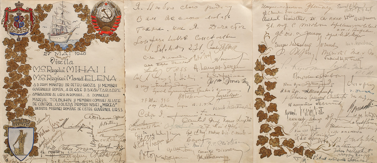 38. Amintirea vizitei Regelui Mihai și a Reginei-mamă Elena cu ocazia primirii navei ”Mircea”, redată Marinei Române de către Guvernul URSS, purtând semnăturile personalităților participante la eveniment