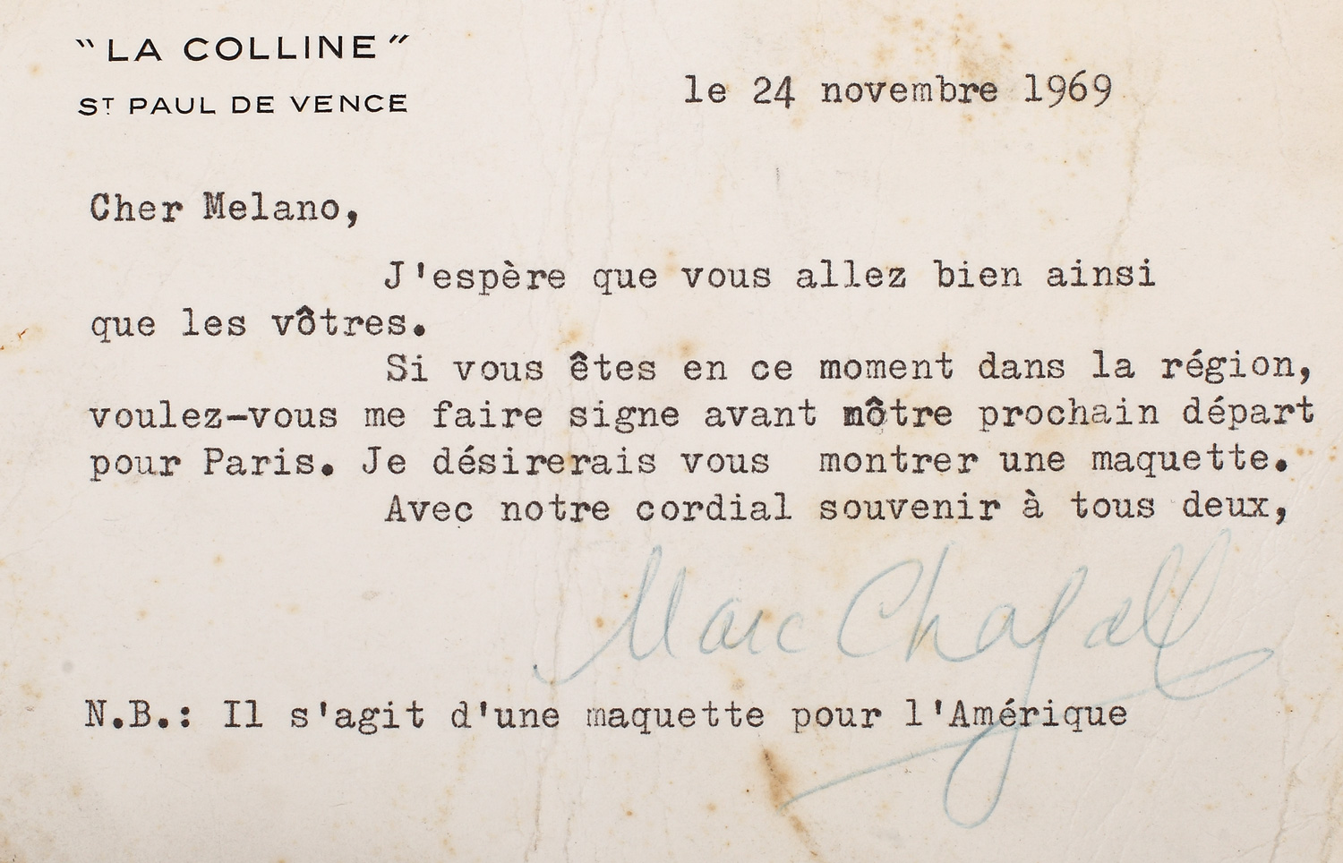 58. Scrisoare dactilografiată a pictorului Marc Chagall, purtând semnătura olografă