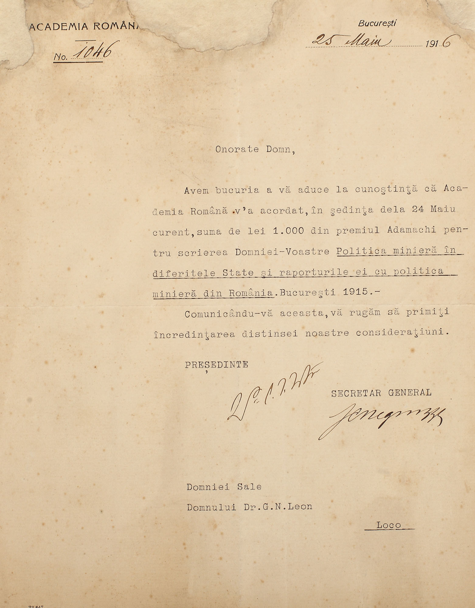 70. Scrisoare dactilografiată, a Academiei Române, purtând semnăturile olografe ale dr. Constantin Istrati, președintele Academiei Române în 1916 și a lui Iacob Negruzzi, secretar general al Academiei
