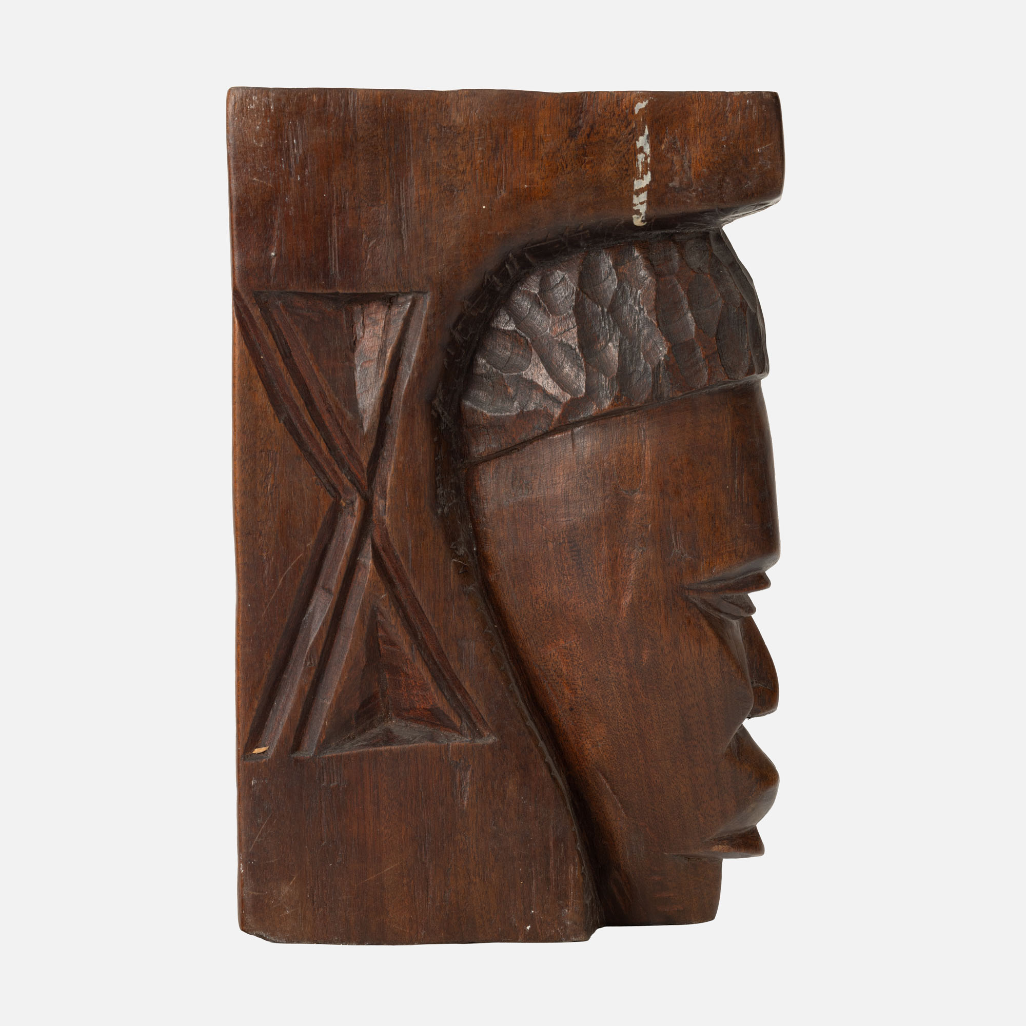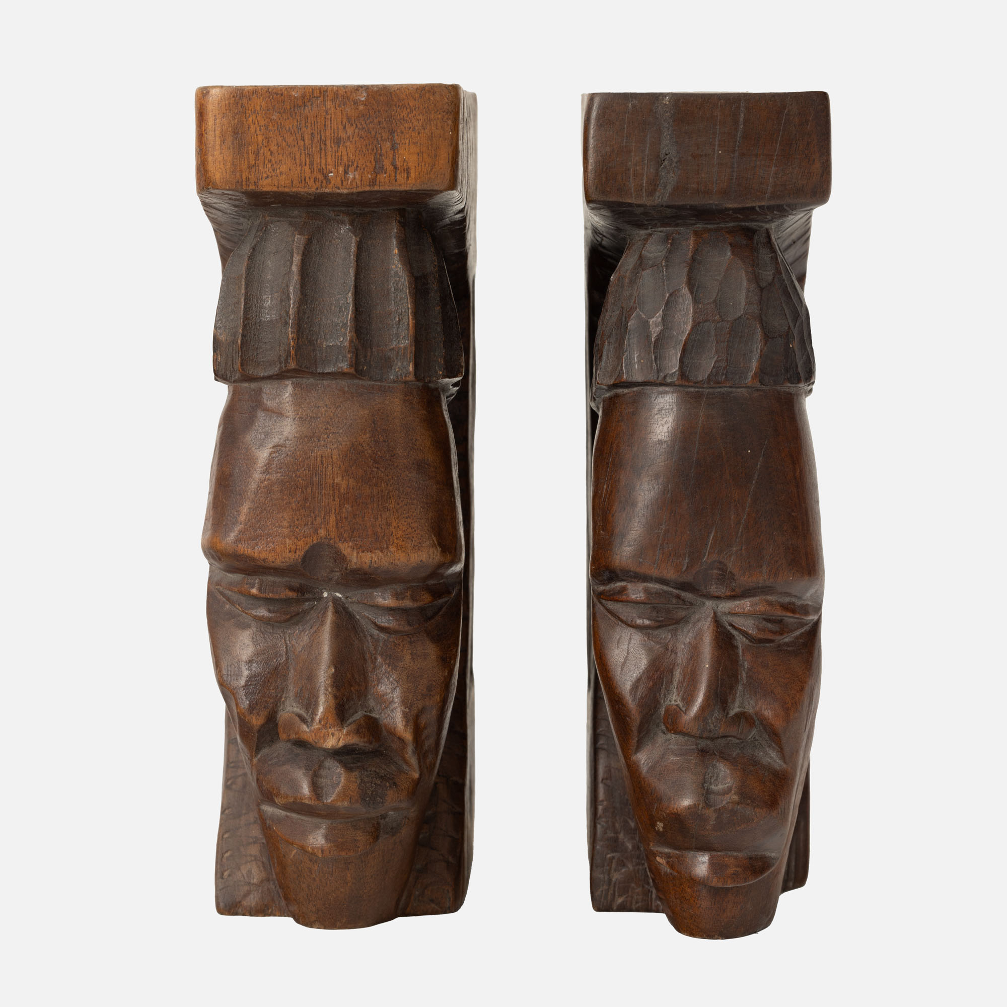 87. Pereche de suporturi de cărți, sculptate în relief cu profiluri de capete africane, bărbat și femeie, Africa Centrală [a doua jumătate a sec. XX]