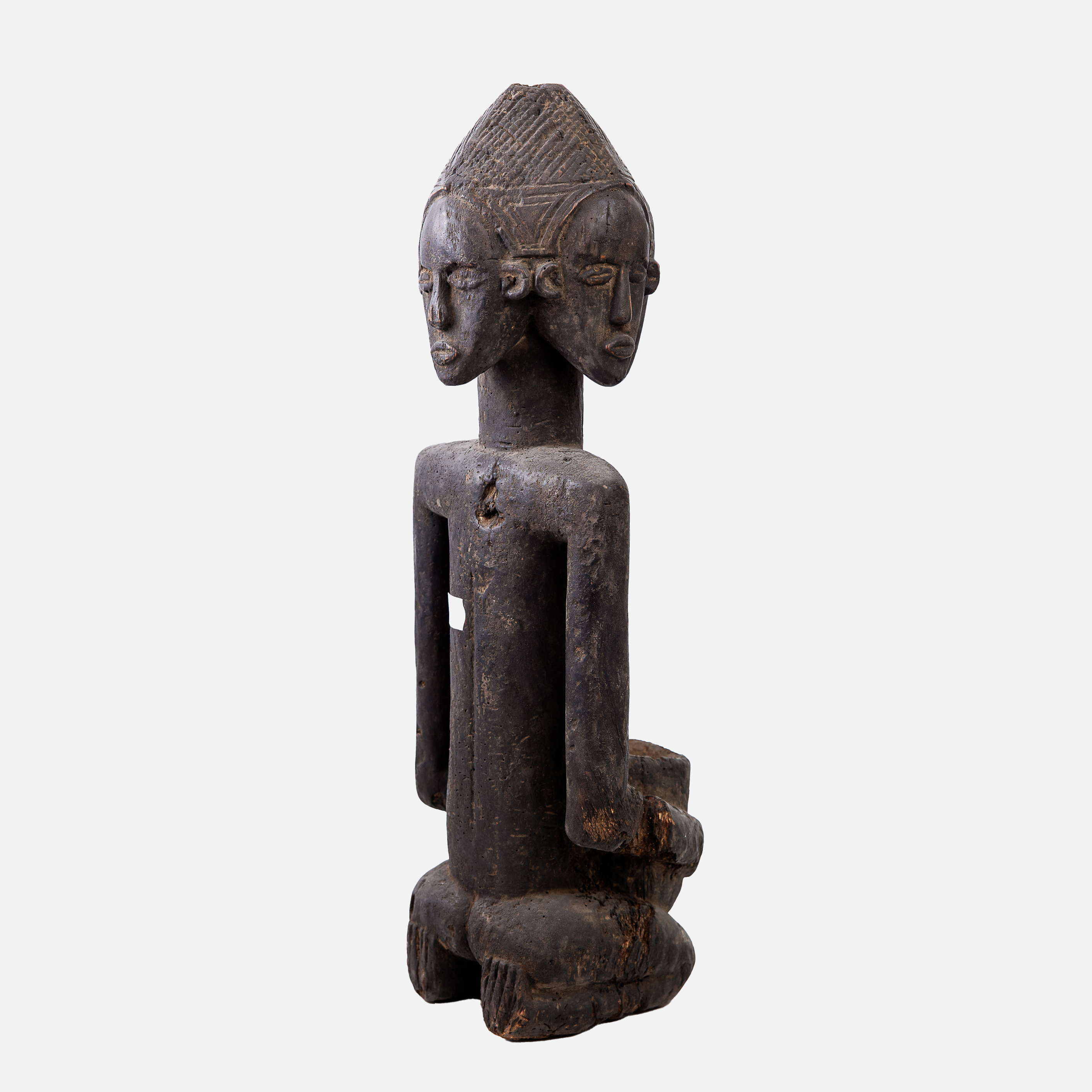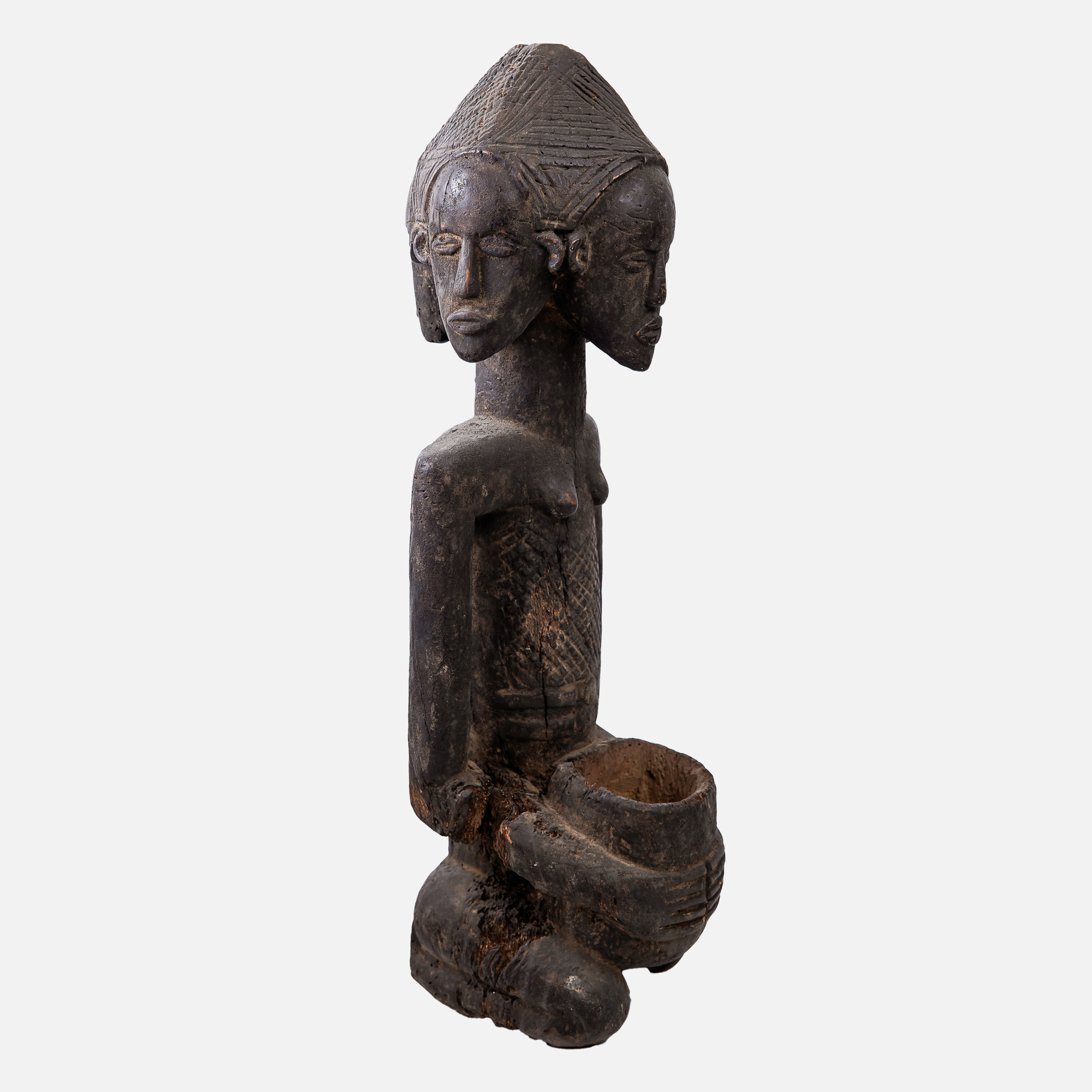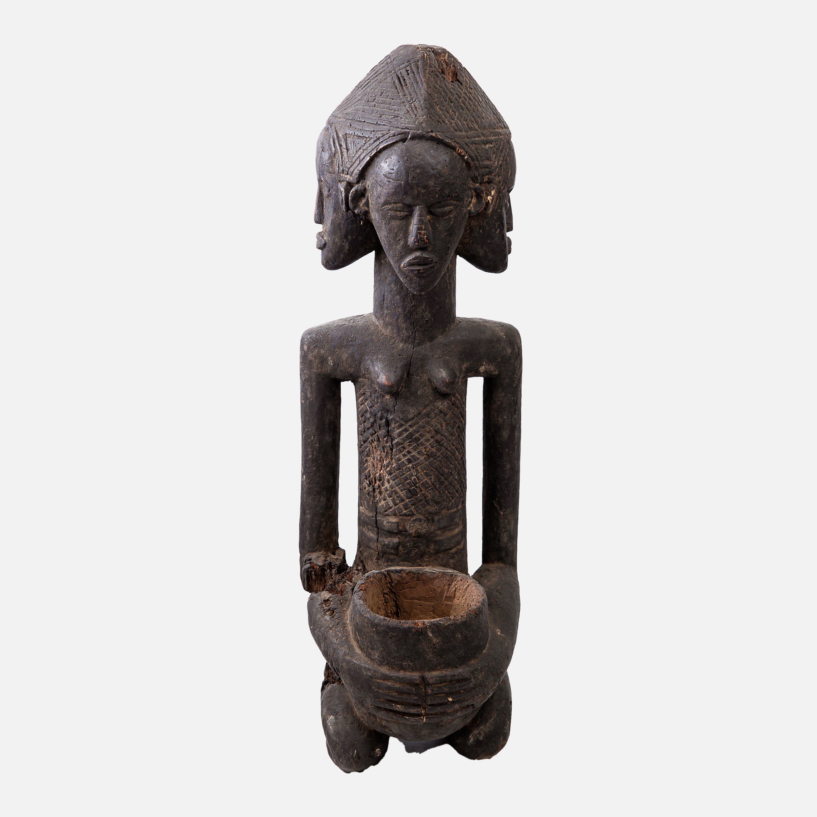 83. Statuetă africană Luba, cu patru fețe și vas ritualic, folosită în ceremonii de divinație, Congo, prima jumătate a sec. XX