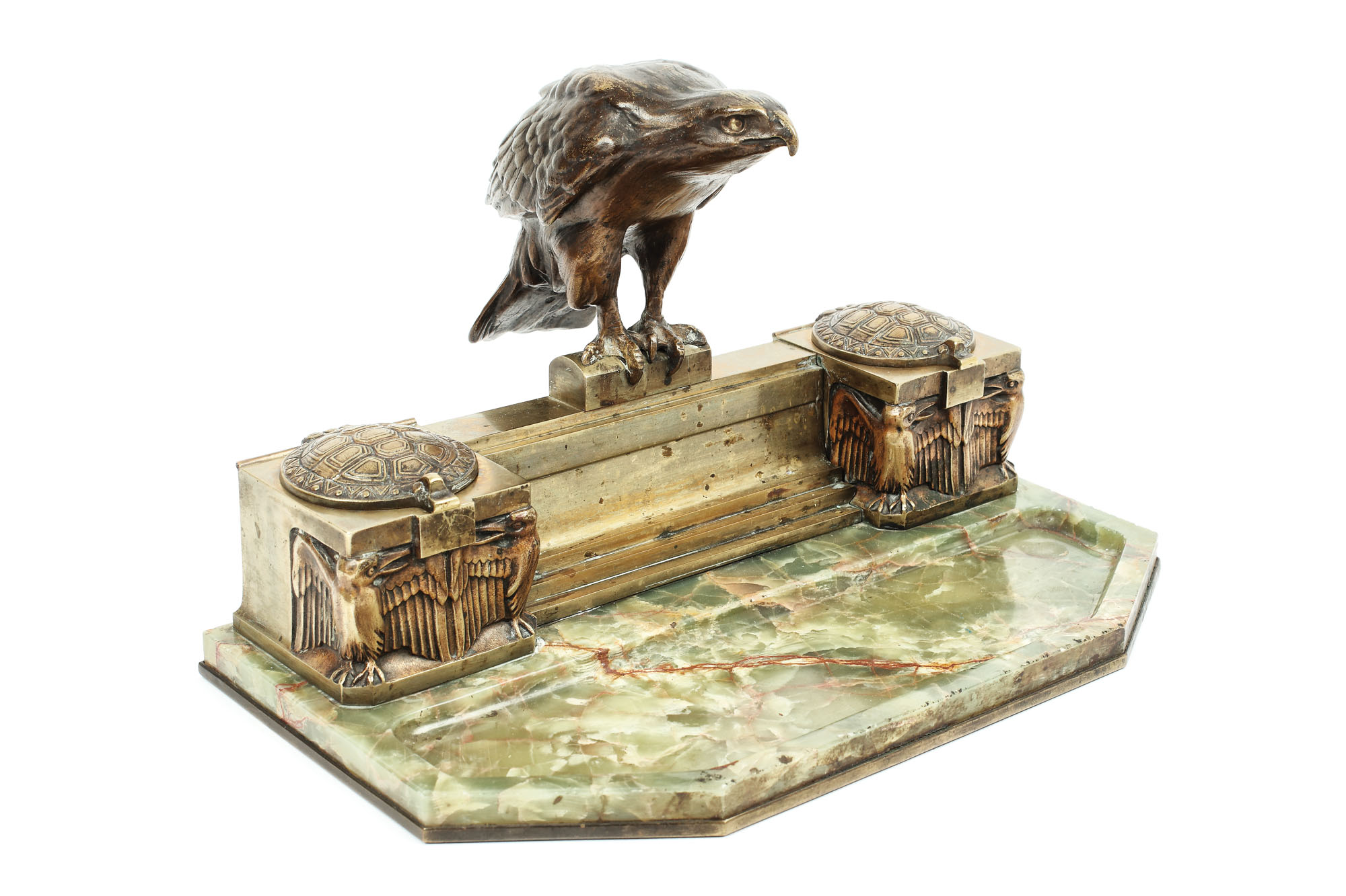179. Călimară Art Deco, decorată cu acvilă și carapace de broască țestoasă din bronz și suport pentru instrumente de scris din onix, cca. 1900