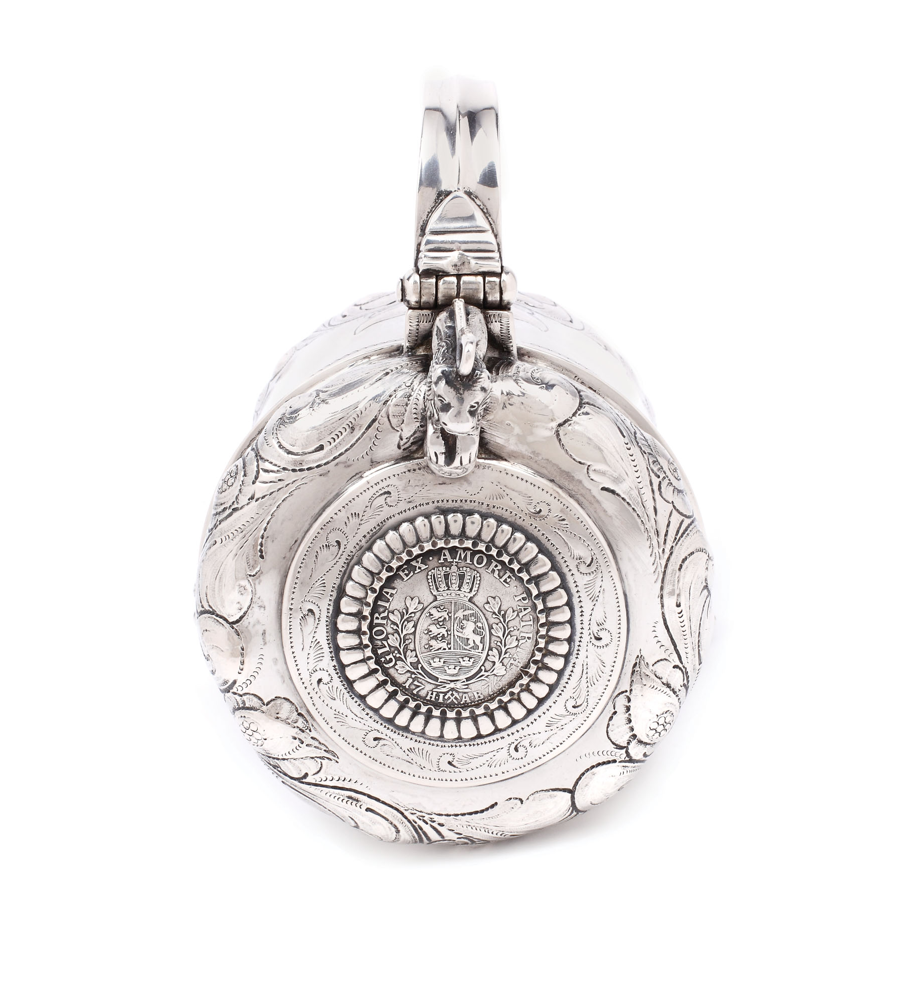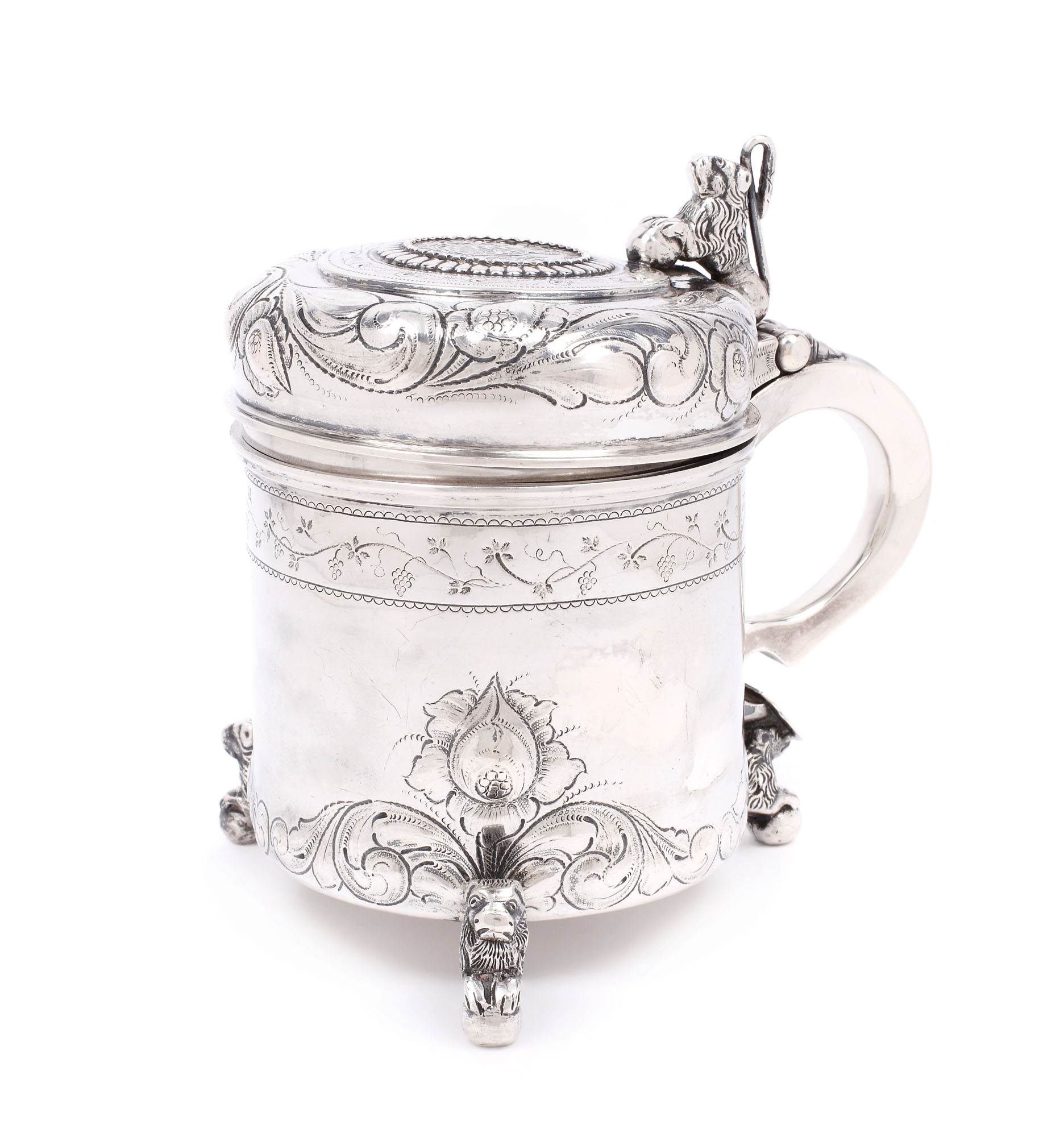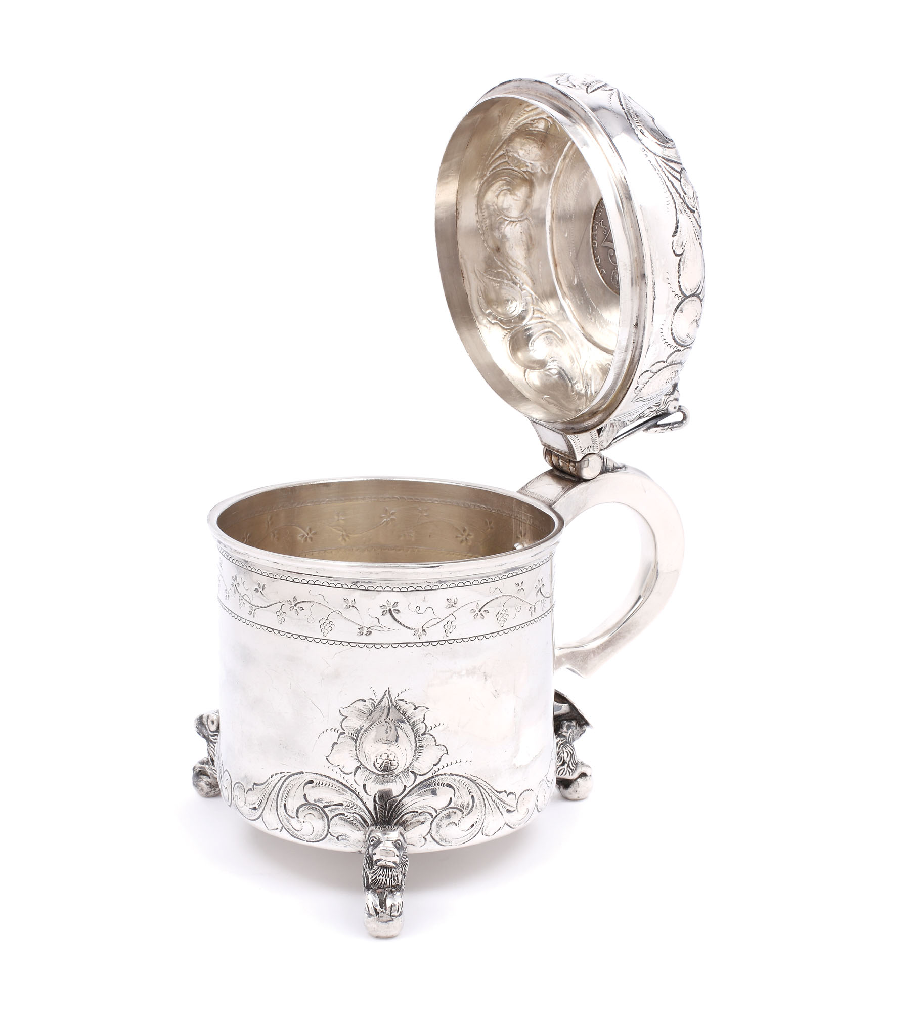 Cană scandinavă, din argint, susținută pe picioare zoomorfe și echilibrat gravată cu motive floral-vegetale. Pe capacul prins în șarniera în formă de leu este încastrată o monedă norvegiană din argint, marcată 1776.