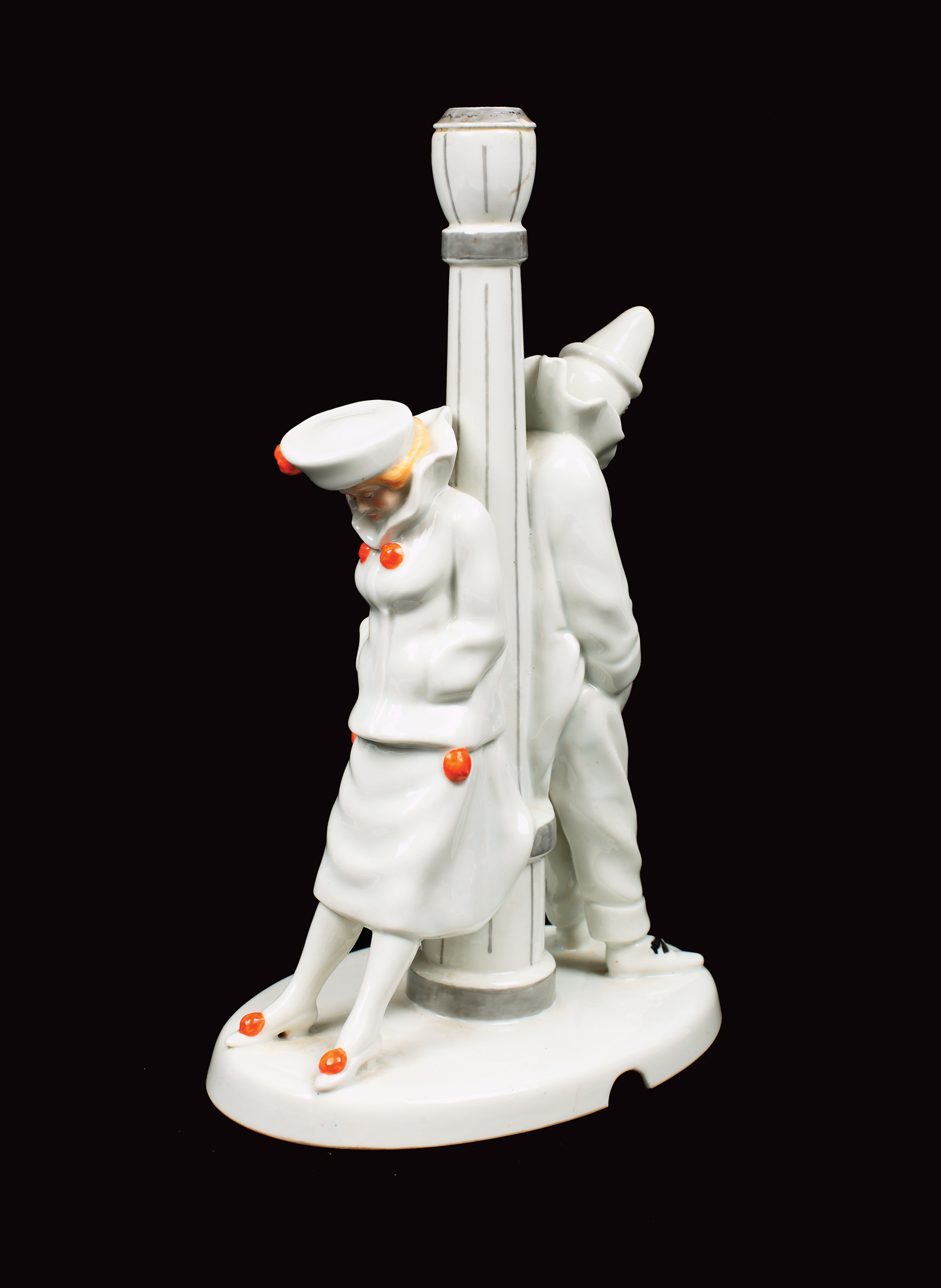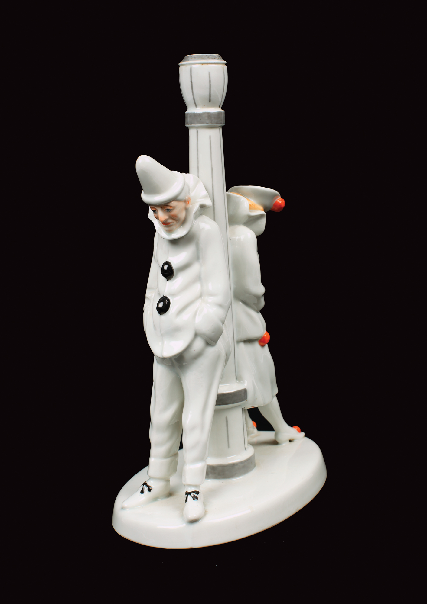 134. Lampă din porțelan Pirkenhammer, ornată cu un cuplu de arlechini [Sec. XX]