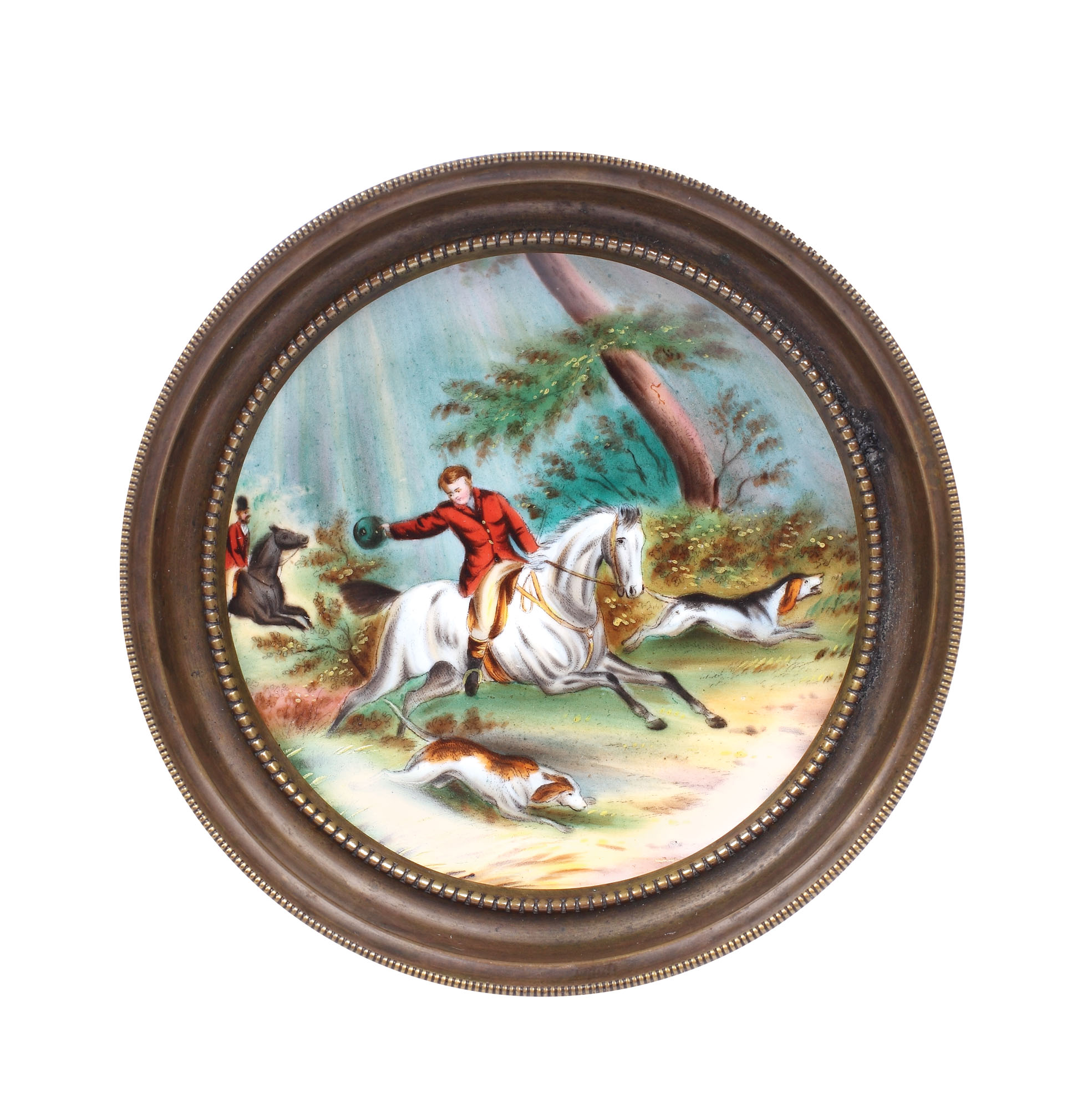 191. Mic vide-poche din porțelan și alamă, pictat cu scenă de vânătoare, cca. 1900
