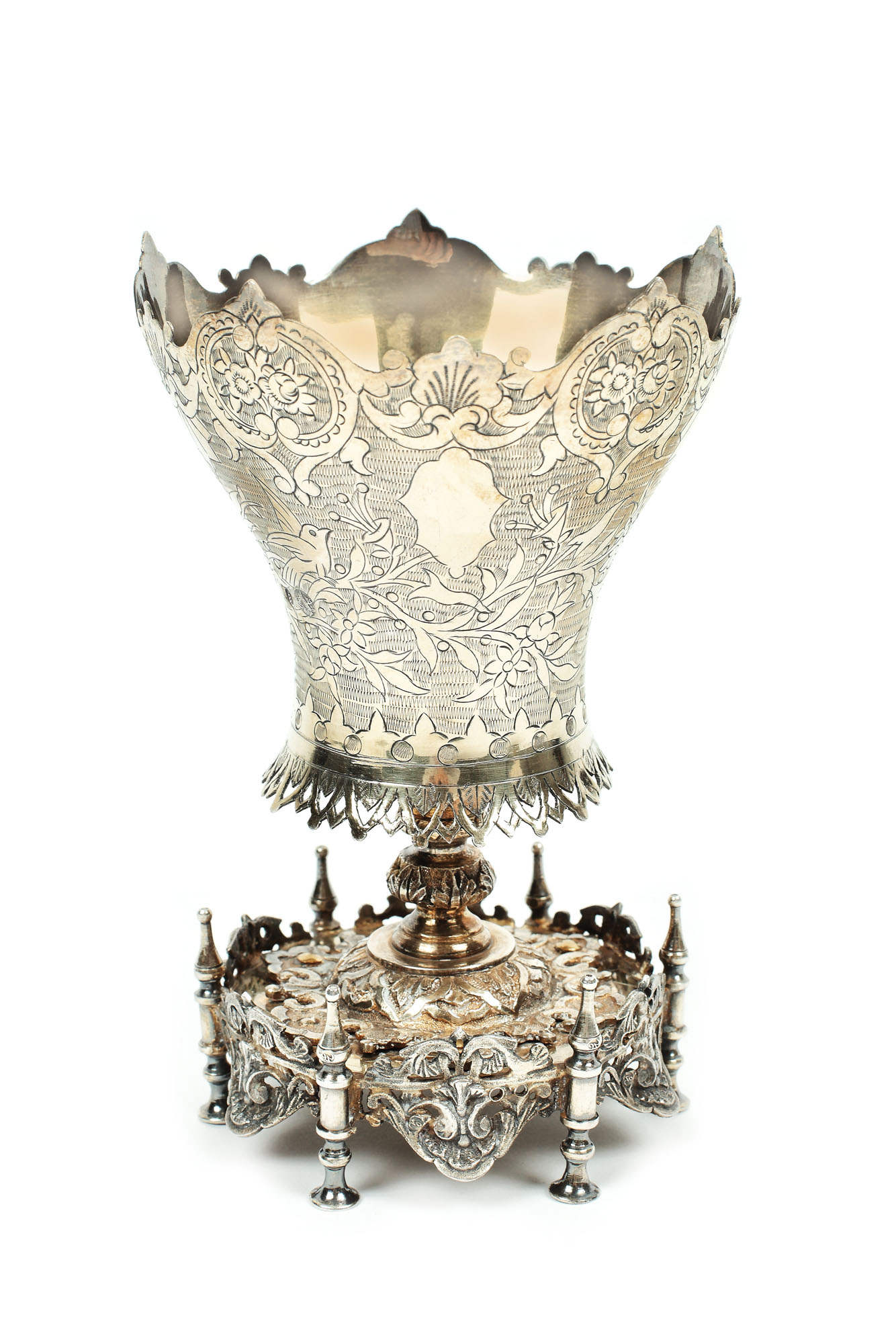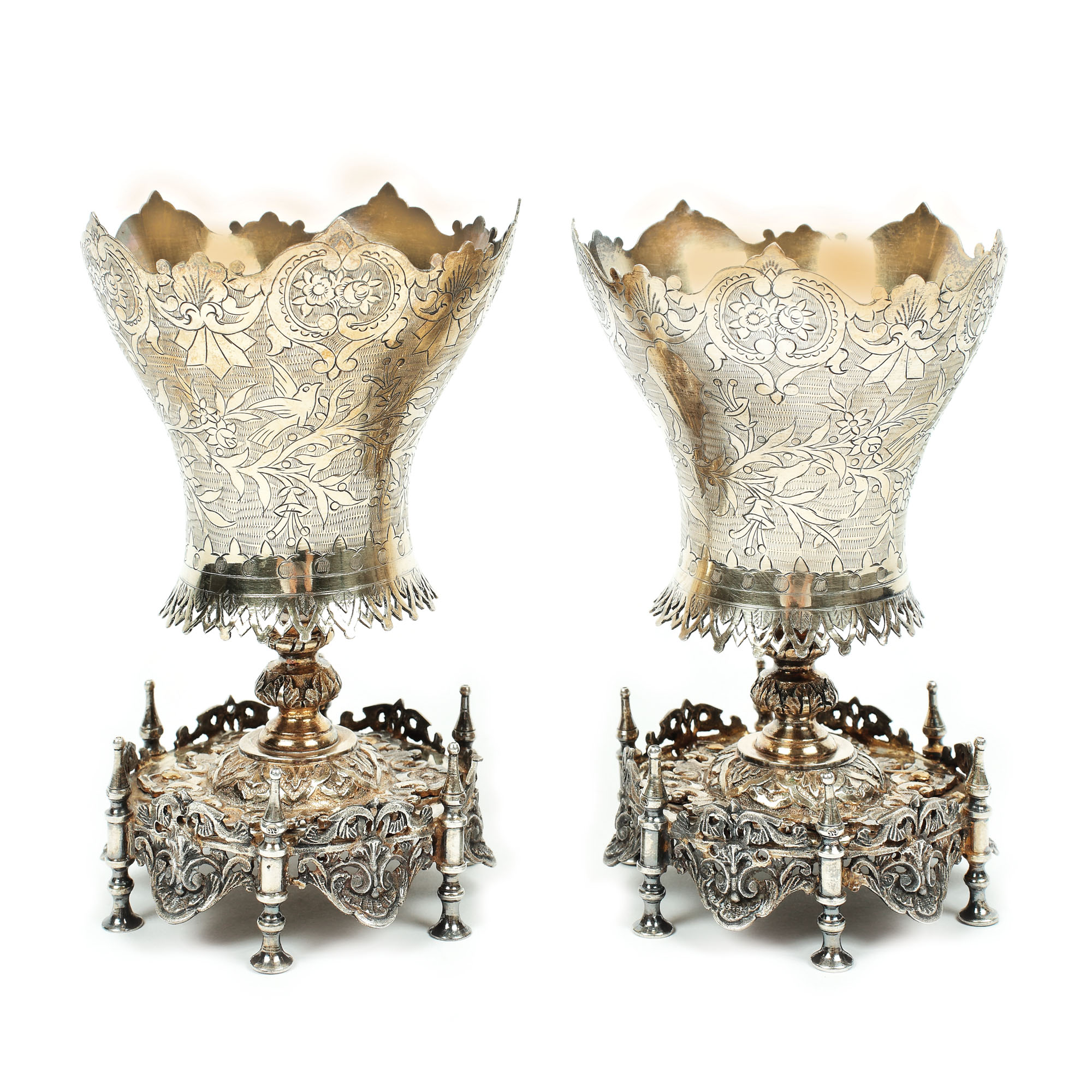 Pereche de pocale marcate cu tughra sultanului Abdülhamid II și susținute de baze cu câte șase pilaștri, în stil otoman, amplu gravate cu decorațiuni împrumutate din registrul floral-vegetal.
