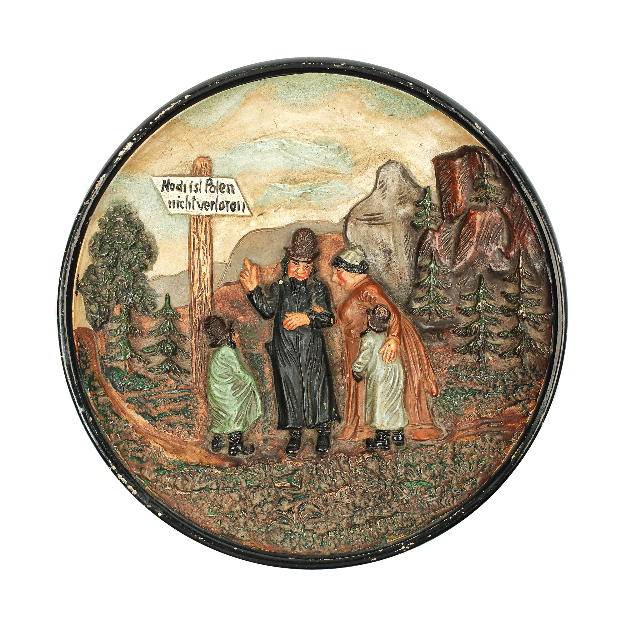 190. "Polonia încă nu e pierdută" - platou decorativ, din ceramică, decorat cu personaje în relief, reprezentând familie de evrei, începutul sec. XIX