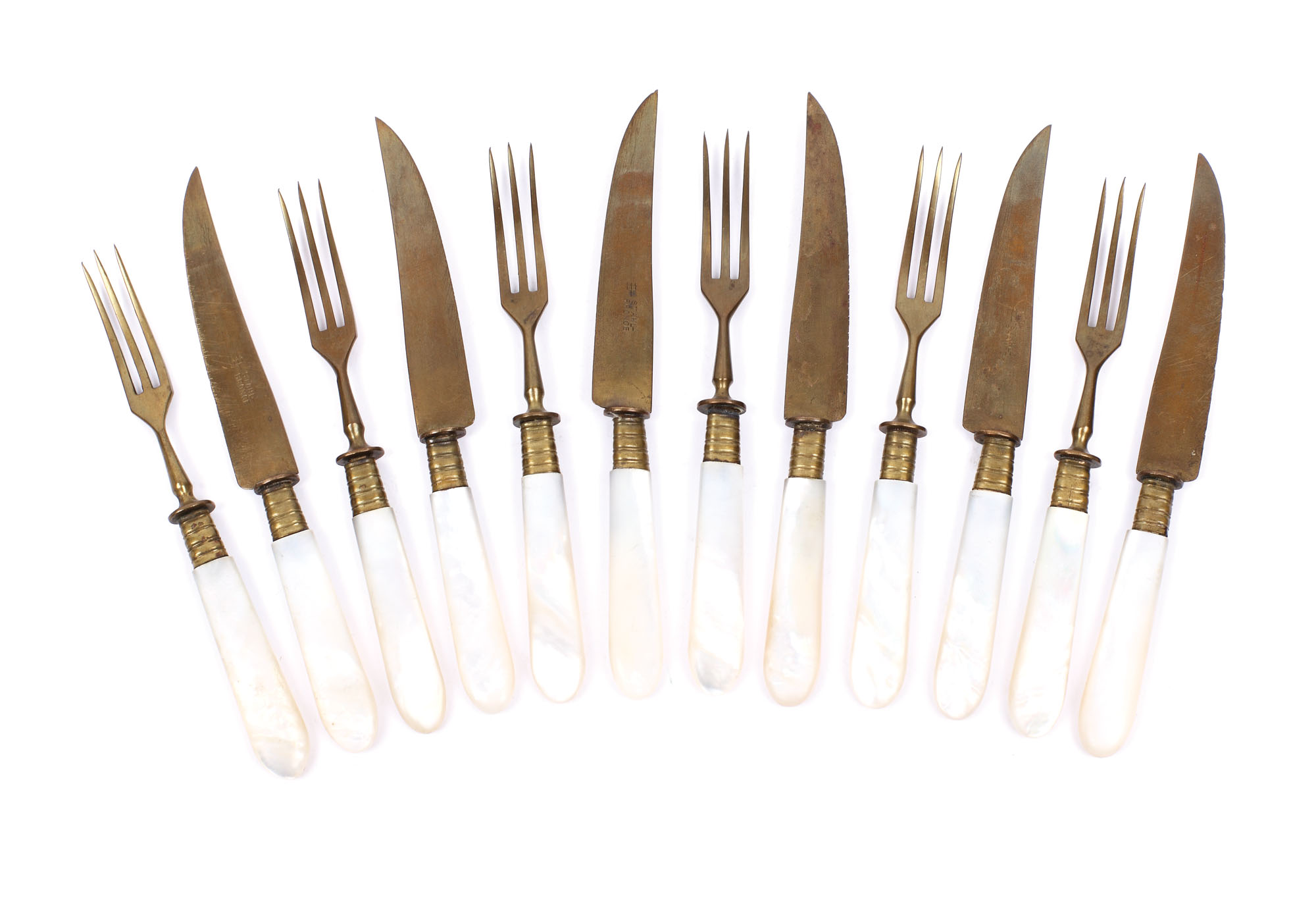 223. Set de 6 persoane de tacâmuri pentru fructe, cu mânere din sidef, cca. 1900