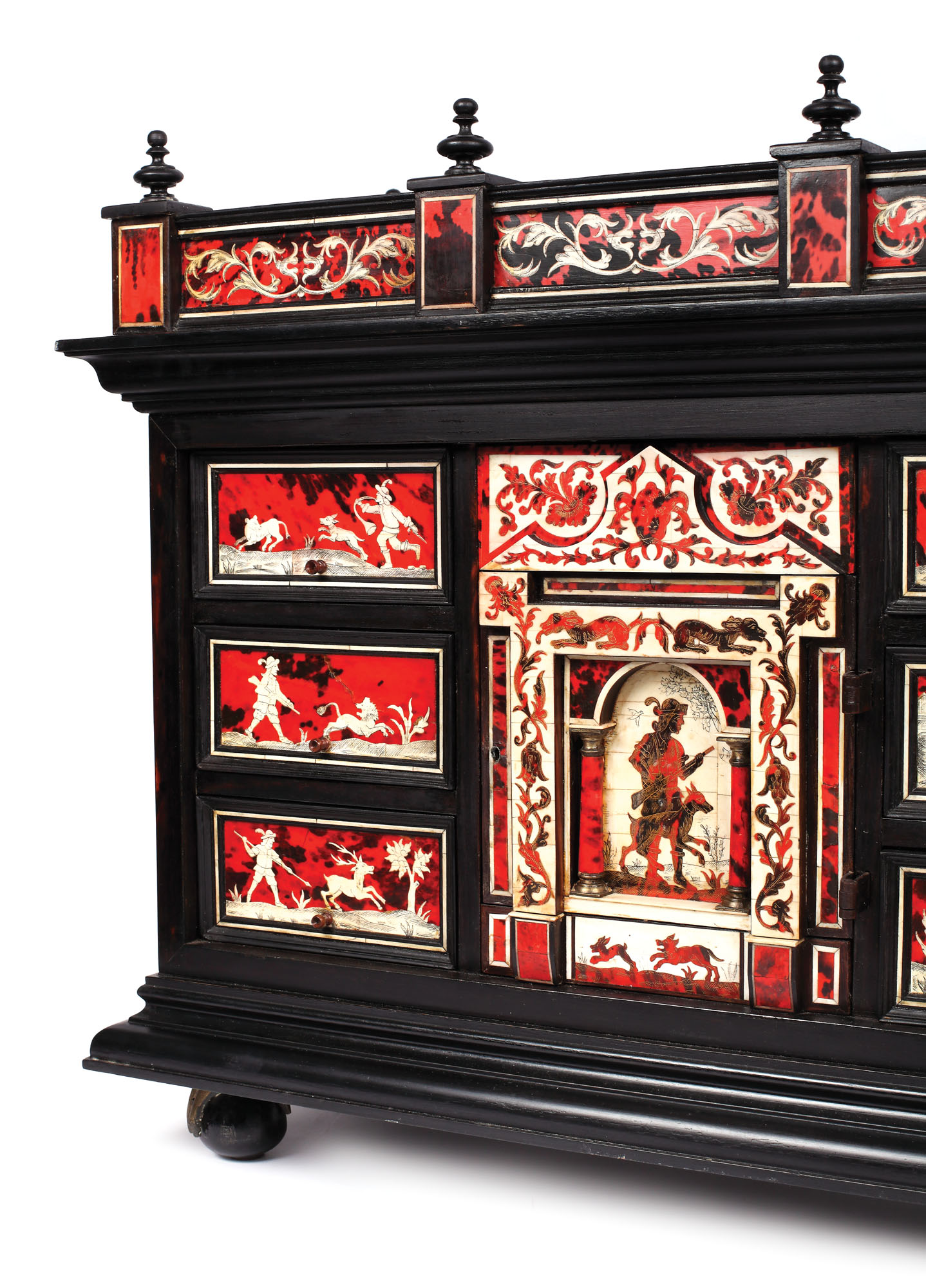 Cabinet compozit format din două corpuri. Corpul inferior, tip masă iberică, se sprijină pe patru picioare strunjite cu bile, legate între ele prin traverse laterale, deasemenea strunjite. De la mijlocul acestora masa este ranforsată prin traverse intemediare din metal, unite sub blat, în dublă acoladă, în maniera caracteristică a meselor iberice.Blatul dreptunghiular este subliniat prin mici cartuşe, delimitate de baghete fine din fildeș. Corpul superior, tip cabinet, se sprijină pe picioare bile cu gheare de pasăre, din bronz. Cabinetul este tratat arhitectonic, cu baza şi cu cornişa profilate, surmontat de o “balustradă” decorată cu cartuşe din fildeș,pe fundal simili baga. Corpul dulapului este decorat bogat, cu decoraţie dezvoltată vertical în trei registre relevate. Registrele laterale, alcătuite din câte trei mici sertare suprapuse, sunt decorate cu plăci din fildeș gravate, pictate în tuș cu scene cinegetice (vânători în peisaj, la vânătoare de cerbi, lei, mistreţi). Registrul central, reprezentat de o uşă bogat decorată cu plăci mici din fildeș reprezentând vânător cu flintă şi ogar, este încadrat de mici coloane, întregul complex fiind anturat de motive vegetale şi câini de vânătoare. Uşiţa maschează două sertare “secrete”, decorate de asemenea cu motive zoomorfe şi vegetale.