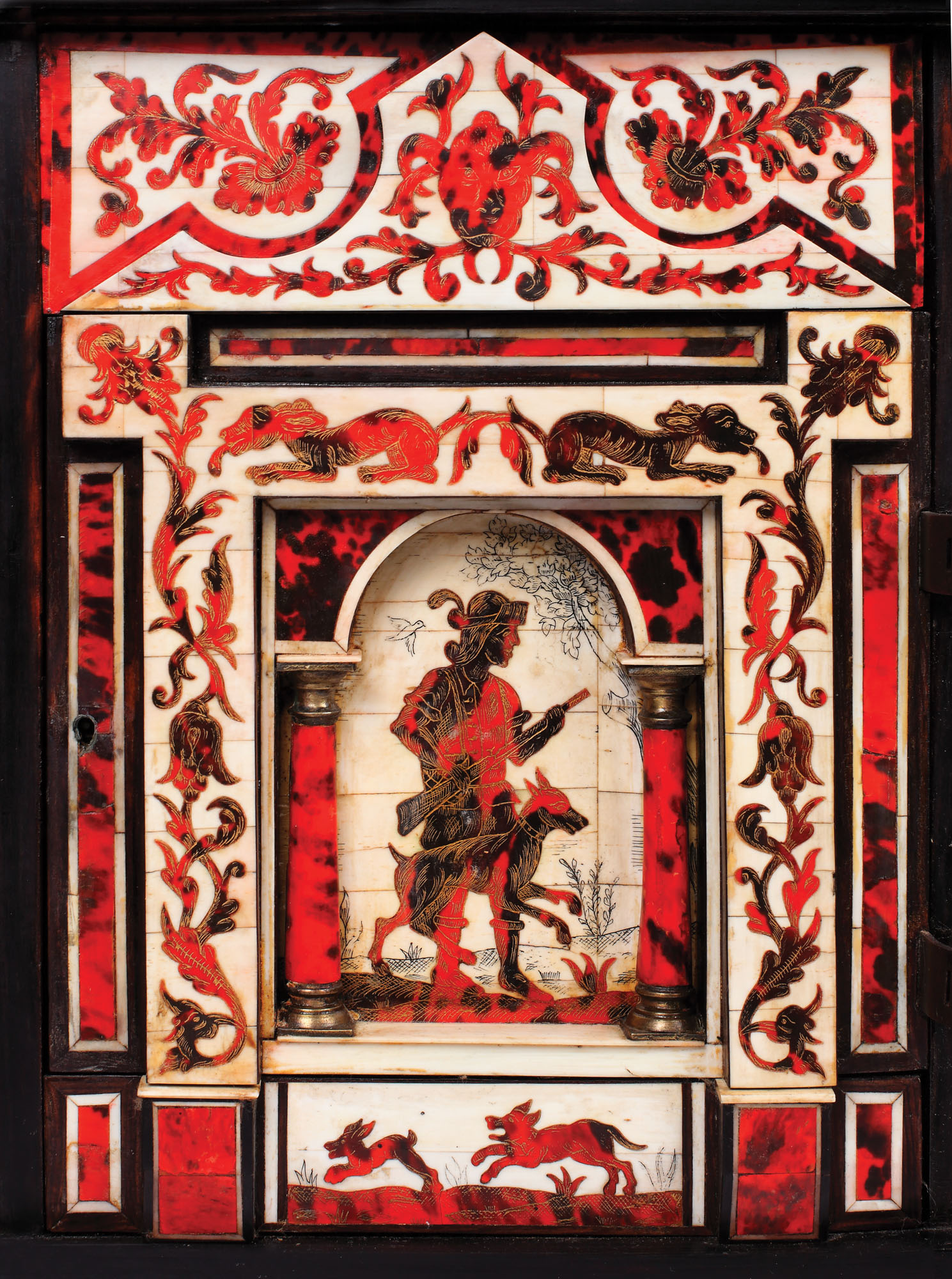186. Splendid cabinet iberic, din fildeș și baga, cu sertare secrete, decorat cu scene de vânătoare cavalerească, sec. XIX
