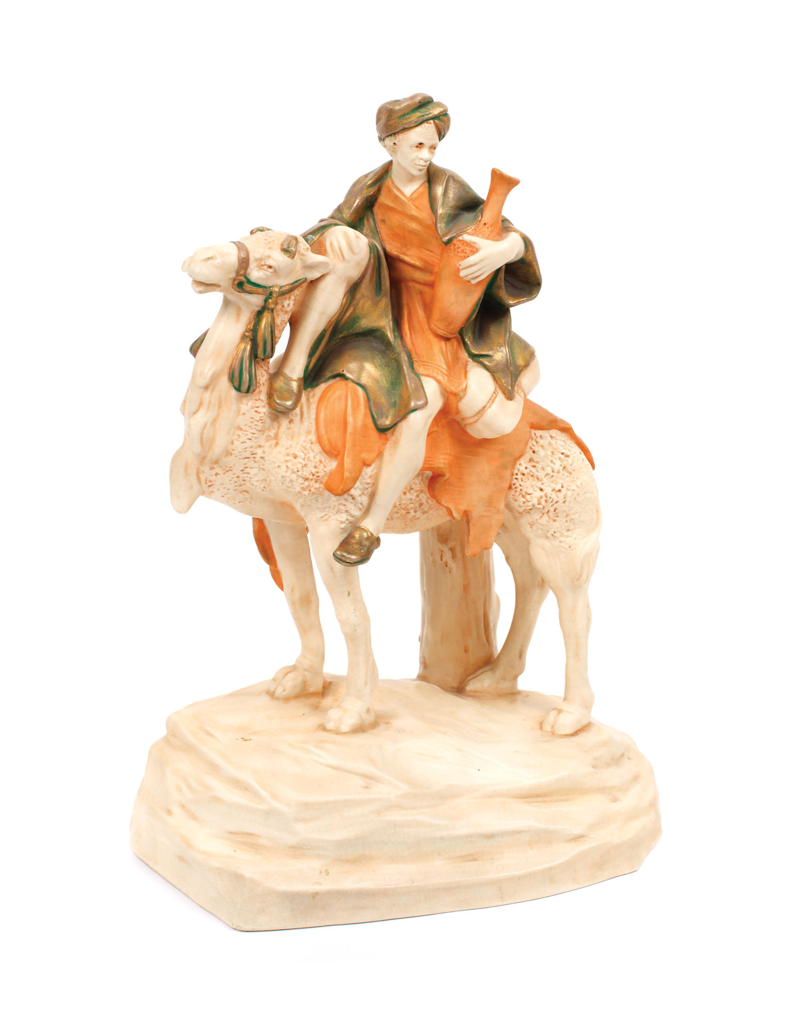 211. Statuetă decorativă Art Nouveau, din porțelan Royal Dux, reprezentând un beduin pe cămilă, cca. 1910