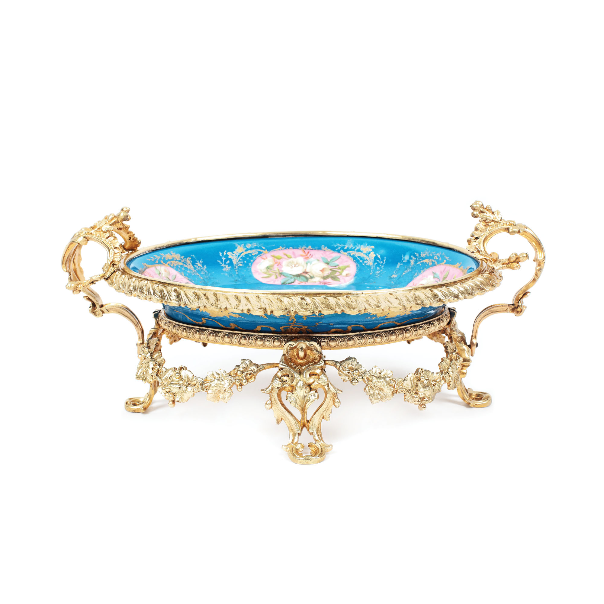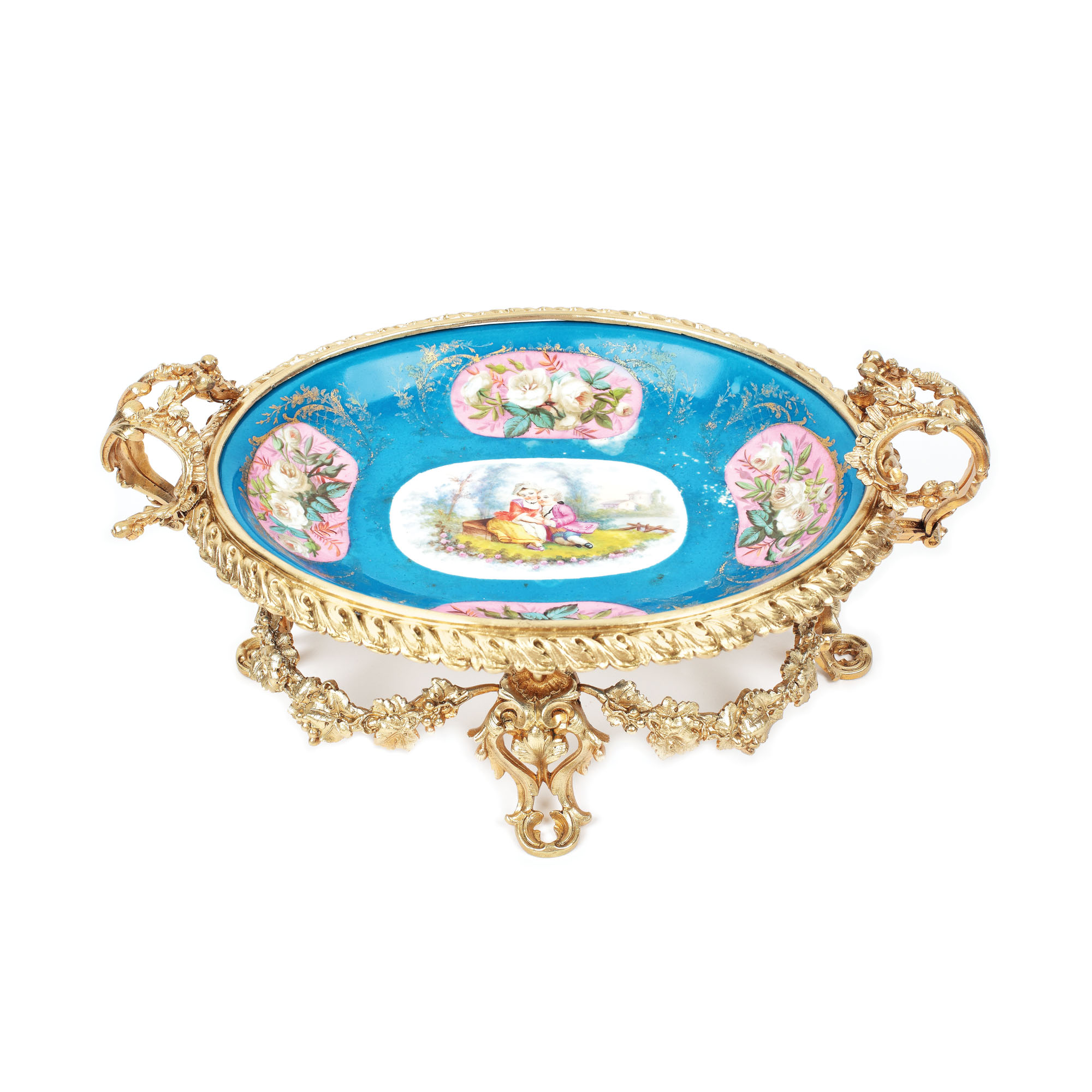 65. Fructieră din porțelan pictat în manieră Sèvres, pe suport din bronz