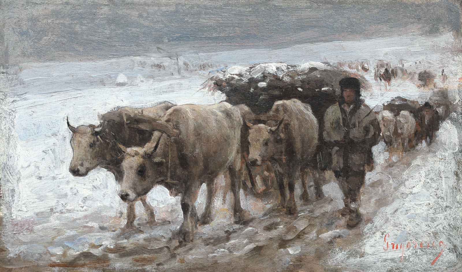 După o perioadă plein-air-istă la Barbizon, itinerarii de studiu la Viena, Roma, Constantinopol sau Vitré, acompaniate de reveniri în preaiubita țară, artistul Grigorescu se pregătea în anul 1877 pentru unul din momentele ce avea să îi devină pildă și experiență vie- războiul de neatârnare. Avea să participe în cadrul campaniei nu doar ca artist-reporter, ci mai mult decât atât- ca artist al neamului, demonstrându-și credința față de sorginte și față de armata tânără a țării. Însoțit de o droșcă trasă de trei cai mici, în care își așează cele necesare pentru mâncat, dormit și pictat artistul va răzbate zilnic drumurile și plaiurile natale- pline de această dată de dorobanți, călărași, roșiori, de arme, de tranșee, de cai de război sau de prizonieri în locul ierbii crude și a turmelor de oi mânate de ciobănași. Plevna, Corabia, Turnu Măgurele, Nicopole, Valea Rahovei, sau Smârdan vor fi locurile în care artistul își va face itinerariul ca martor de război, alături de bătrânul Szathmári, Sava Henția și George Demetrescu Mirea, întâmpinând realul primejdios al fiecărei zile și memorând în schițele și în uleiurile de mai târziu pagini ale unei istorii , trăite de aproape. Instantaneele prinse pe viu ne înfățișează portrete ale ofițerilor, coloneilor, soldaților, uneori și autoportrete, cai de război, arme, convoaie de prizonieri, tabere, corturi sau pontoane. Alteori însă, atenția i se îndreaptă către natură, către localnici și către carele cu boi ce transportau proviziile de război, pe drumuri anevoioase de iarnă. De dimensiuni mici și ușor detaliată, opera Care cu boi ne înfățișează lealitatea unei execuții sensibile, realizate de artist în împrejurările unor vremuri greu încercate, unde curajul și temeritatea au stat drept sprijin izbândei naționale. Pitorescul, de această dată grav, ne evocă un trecut leal, redat de artistul Grigorescu în maniere sincere, mișcătoare. (G.M.)