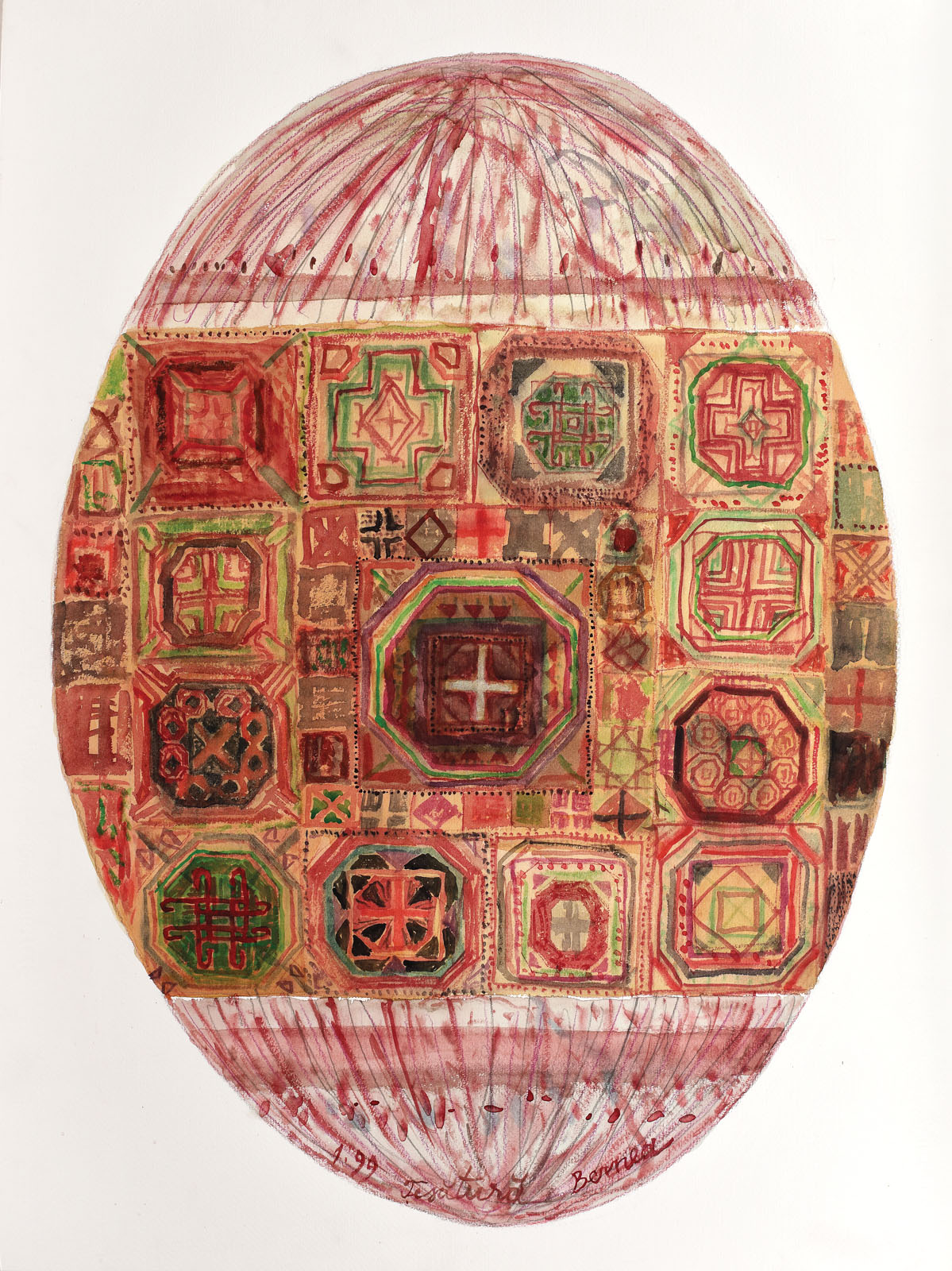 semnat, datat și intitulat central jos, cu roșu, "Bernea, Țesătură, 1.(19)99"