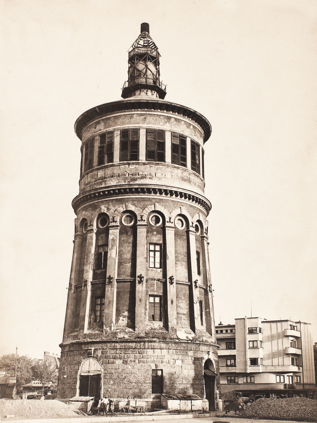 56. Fotografie cu Foișorul de Foc la 1930, lângă un nou bloc de locuințe proiectat de Marcel Iancu