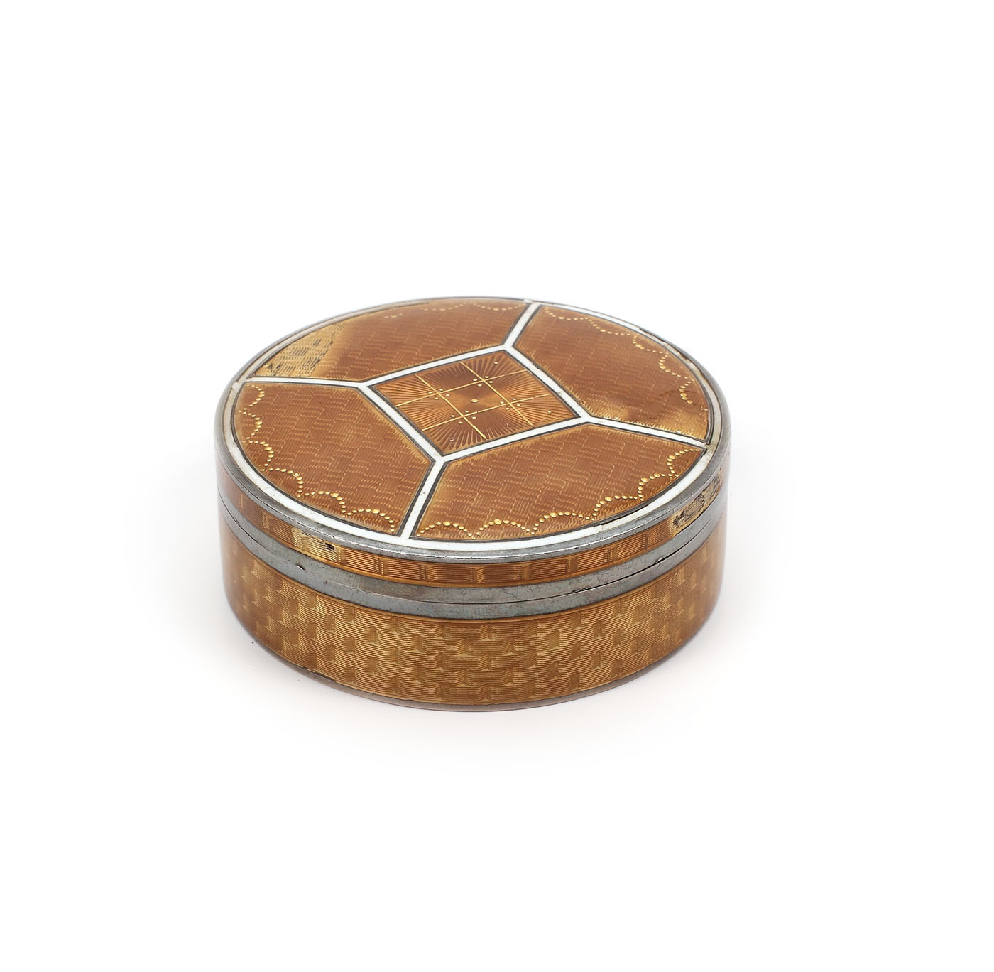 Cutie cu capac, aurită în interior, decor guilloche galben-auriu, cu lambrechin și motiv romb central.