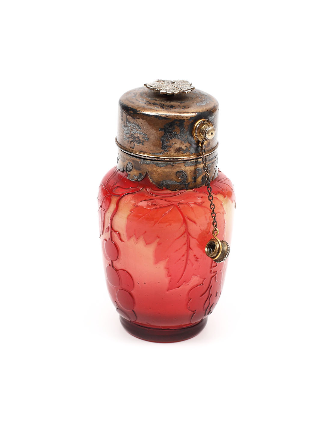 Flacon de parfum producție industrială, cu decor frunză de viță și struguri. În stil Art Deco.