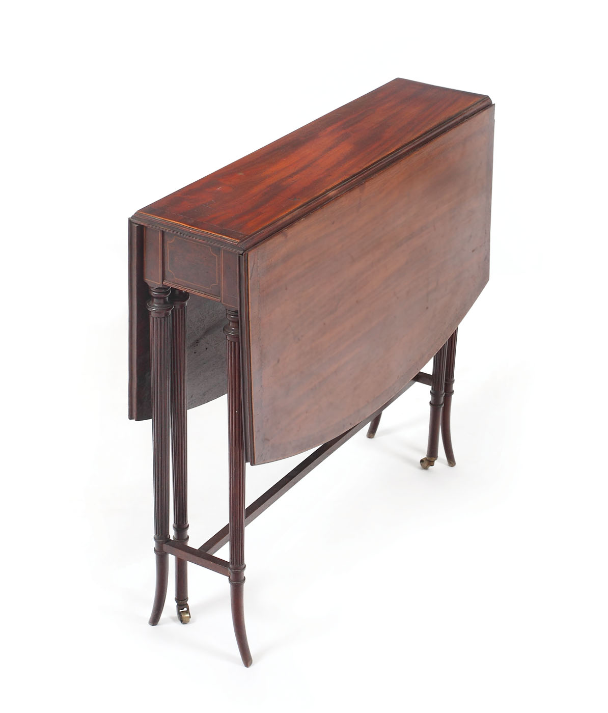 Măsuță cu picioare colonete canelate, unite prin traversă în "H", cu două voleuri rabatabile, susținute de piciorușe pe rotile. Blat dreptunghiular rotunjit la capete cu fileturi marchetate.
