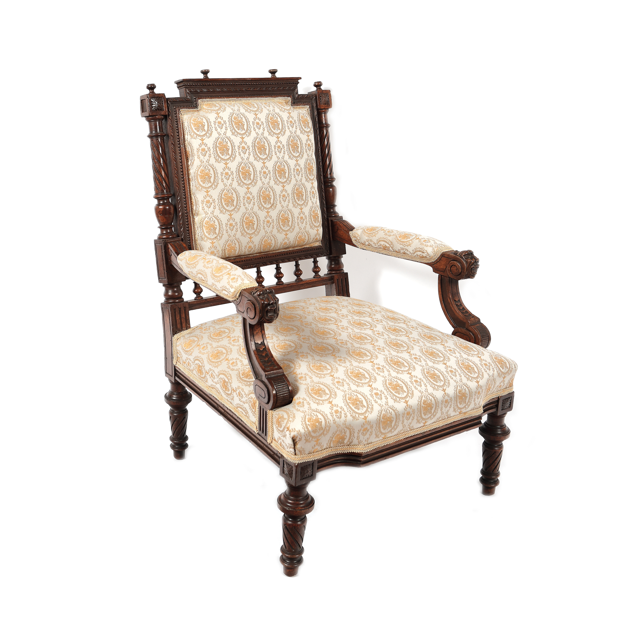 133. Fotoliu în manieră Historistă, cu mascaroane sculptate la terminațiile mânerelor, provine din colecția familiei Spiru și Simona Chintilă [Sec. XX]