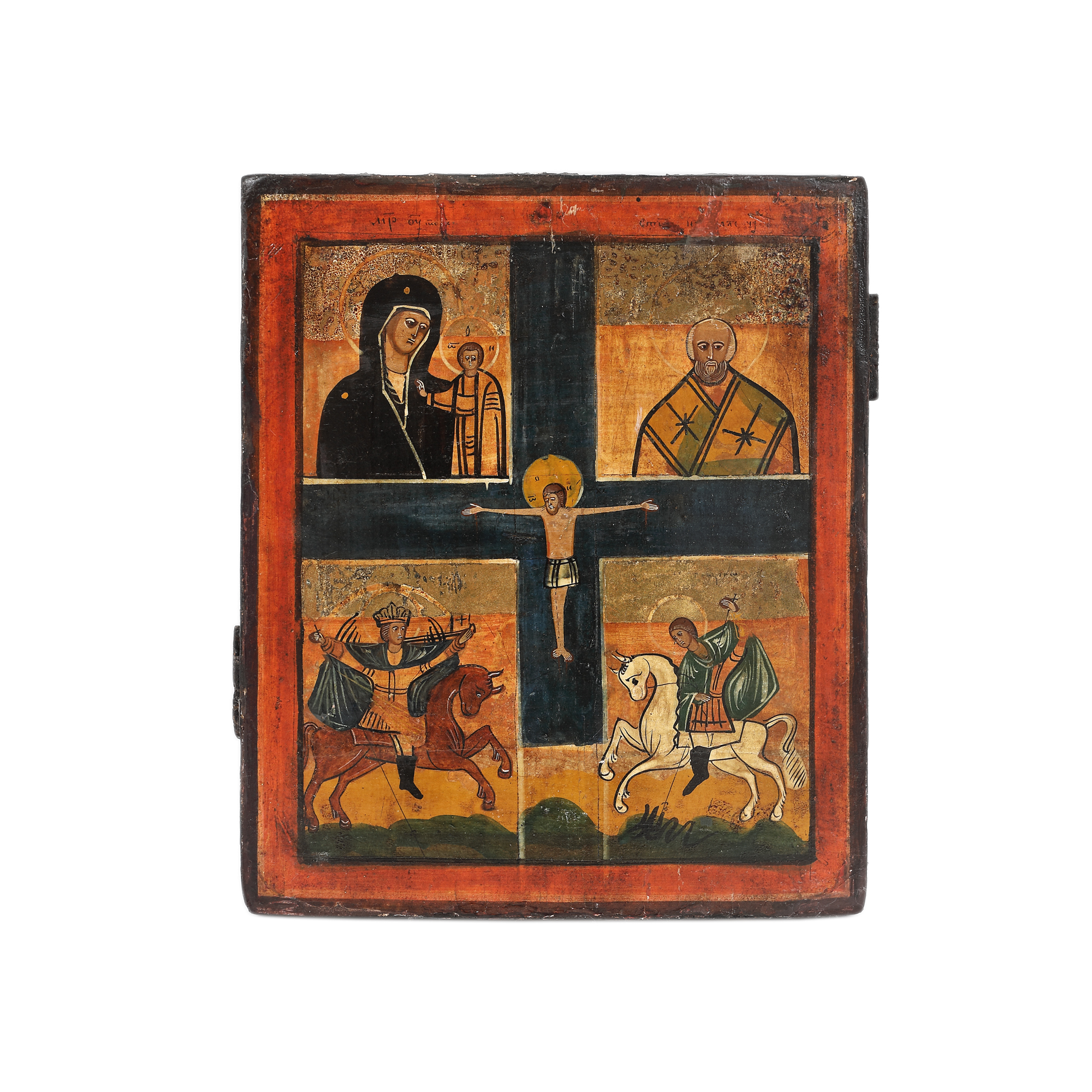 86. Icoană pe lemn, în patru registre, ”Maica Domnului cu Pruncul (Kazanskaia), Sfântul Nicolae, Sfântul Arhanghel Mihail și Sfântul Gheorghe ucigând balaurul”, școală rusească, sfârșitul sec. XIX, provine din colecția familiei Spiru și Simona Chintilă