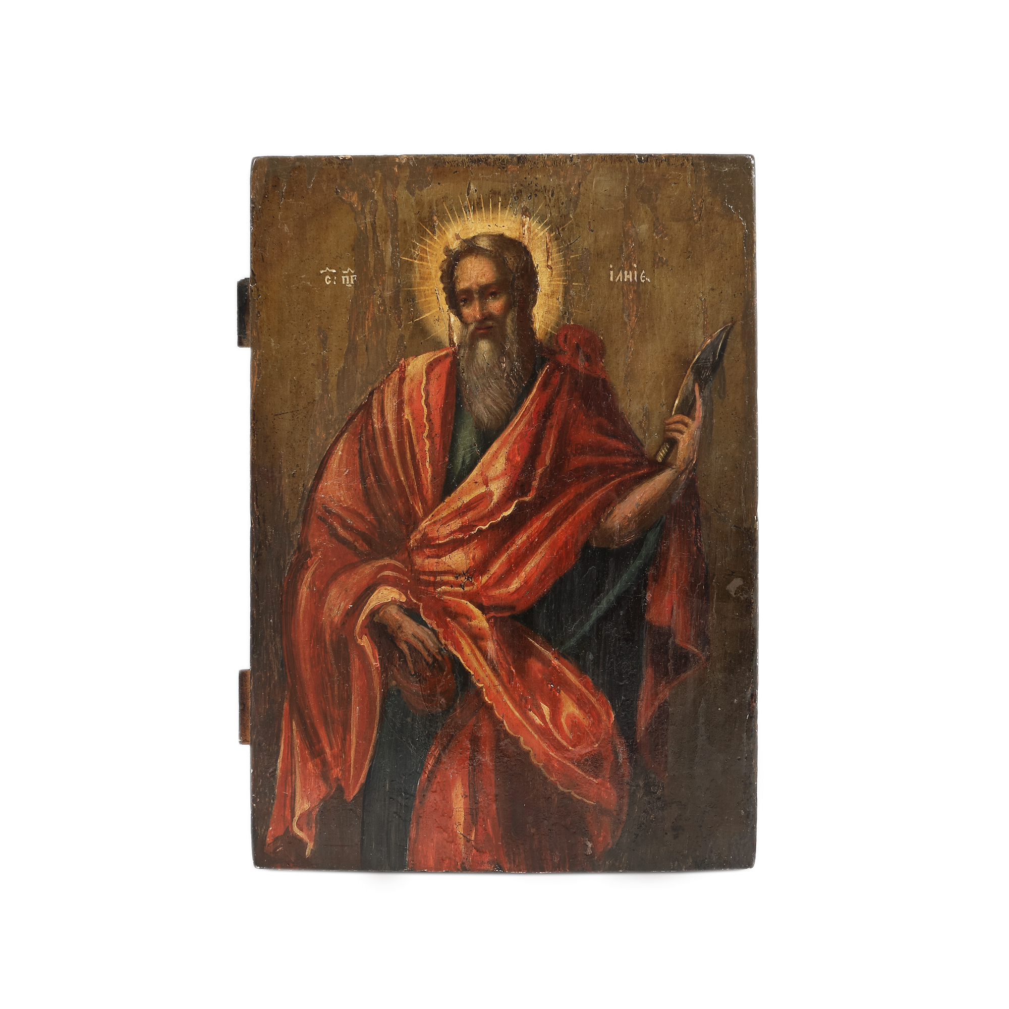 84. Icoană pe lemn, ”Sfântul Prooroc Ilie”, școală românească, posibil atelier Gheorghe Tattarescu, a doua jumătate a sec. XIX, provine din colecția familiei Spiru și Simona Chintilă