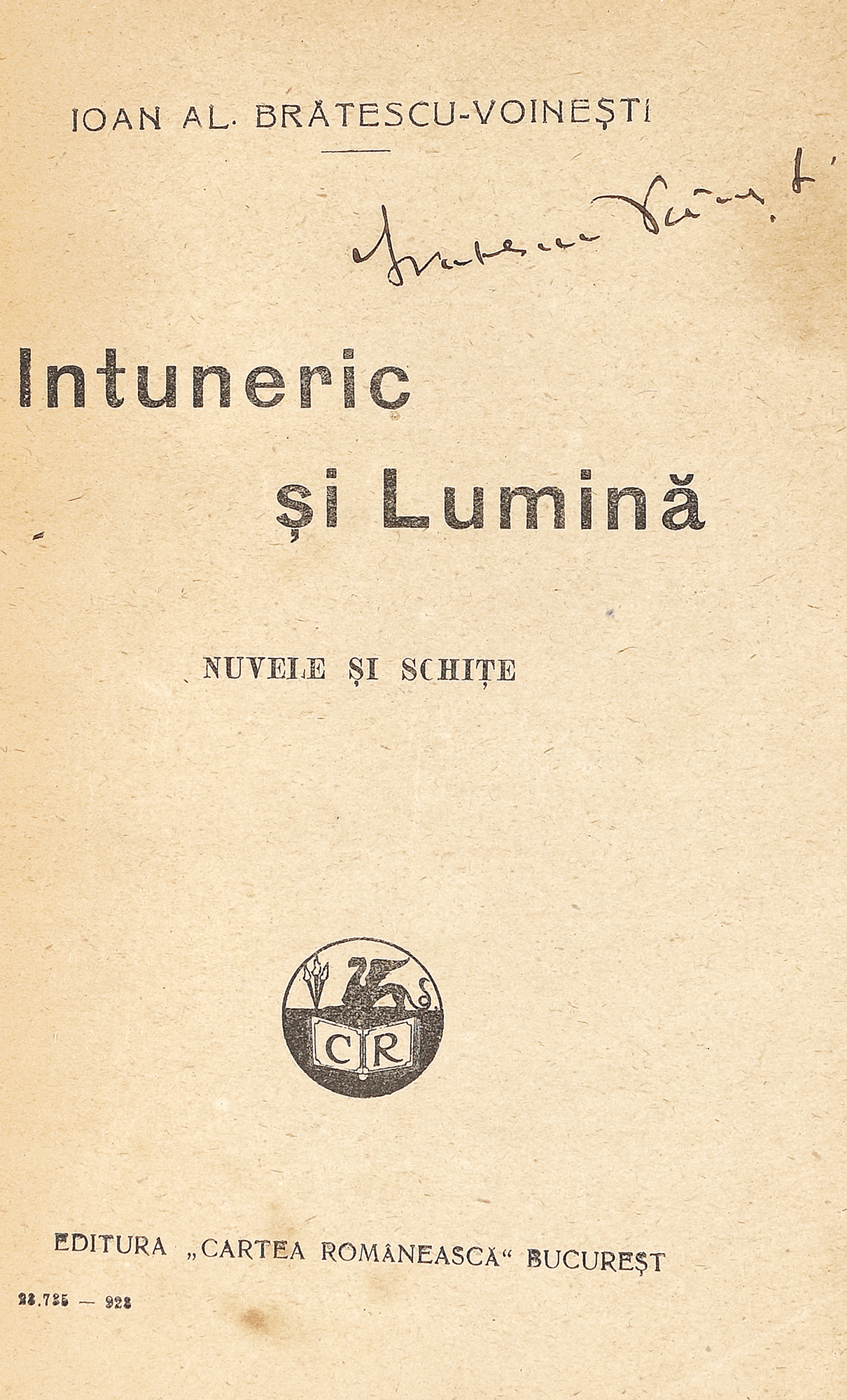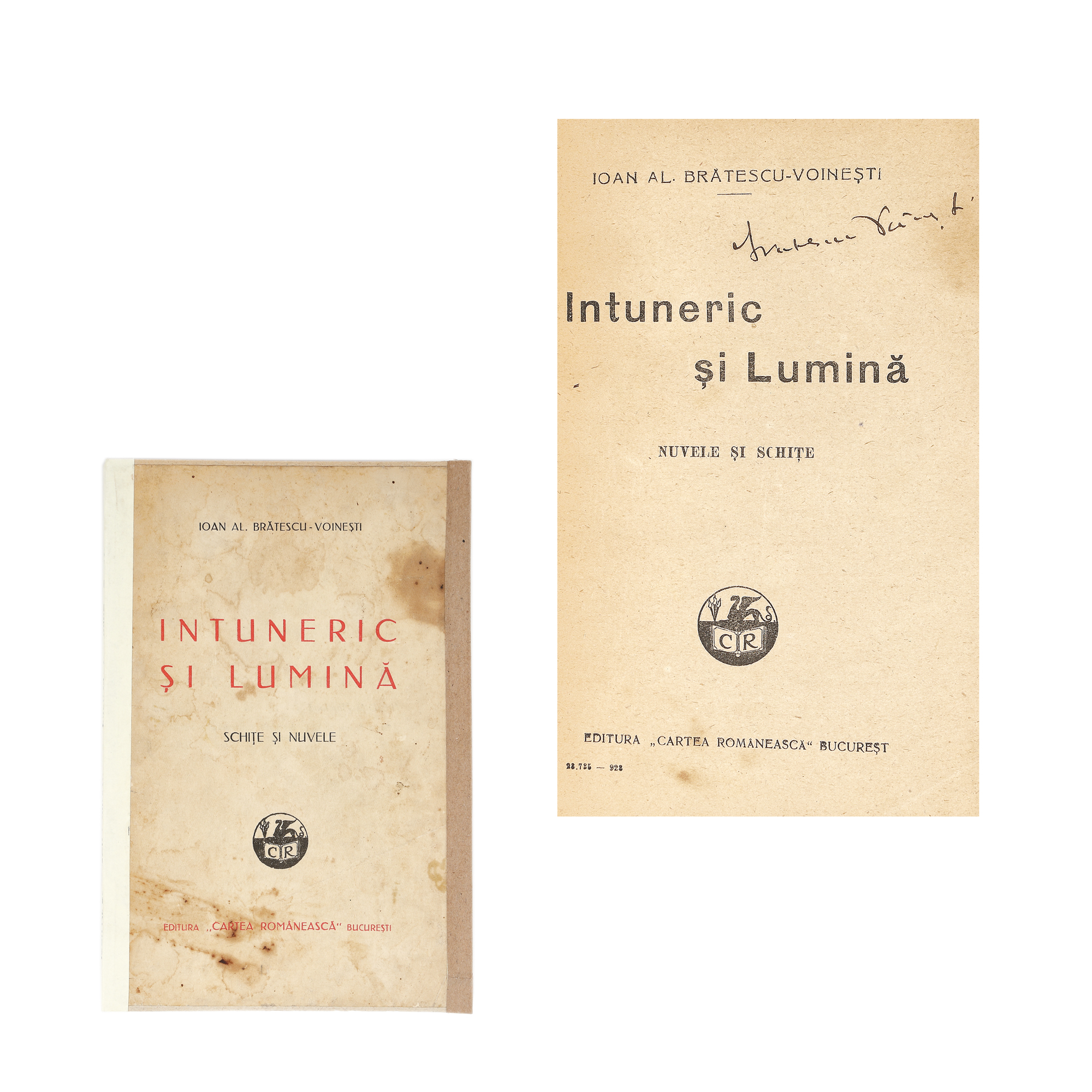 94. ”Întuneric și lumină”, de Ioan Alexandru Brătescu-Voinești, București, 1923, cu semnătura olografă a autorului, provine din colecția familiei Spiru și Simona Chintilă